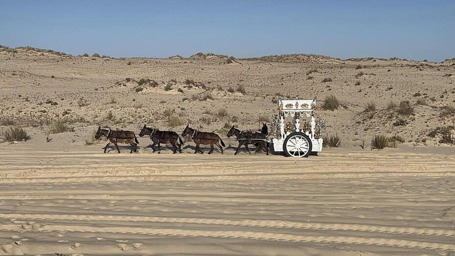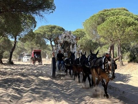 A estas horas de la tarde, (19.00h) a la Hermandad del Rocío de Rota le quedan pocos kilómetros para llegar a la Casa de Hermandad en la aldea almonteña que semanas antes ya se puso a punto para recibir a los peregrinos que tienen en ella sus cuartos para hospedarse. Son por tanto, momentos de impaciencia por llegar, descansar y porque el reencuentro con la virgen del Rocío está más cerca.