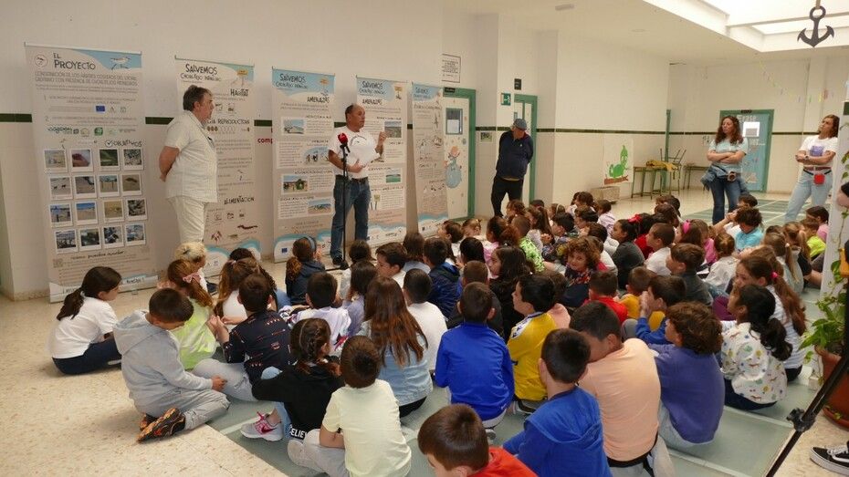 Hoy ante cuatro clases de alumnos de Primaria de Calasanz, se les ha intentado trasladar la importancia de tomar conciencia de ciertas actitudes que no favorecen a la reproducción del chorlitejo patinegro. Para ello, en este centro, habrá durante unos días, hasta la próxima semana, cinco paneles que explican de forma clara cuáles son las amenazas que tiene este ave, cuál es su forma de reproducción, dónde anida, cómo se alimentan y los objetivos en sí de esta campaña.