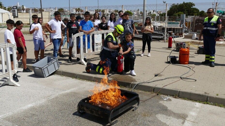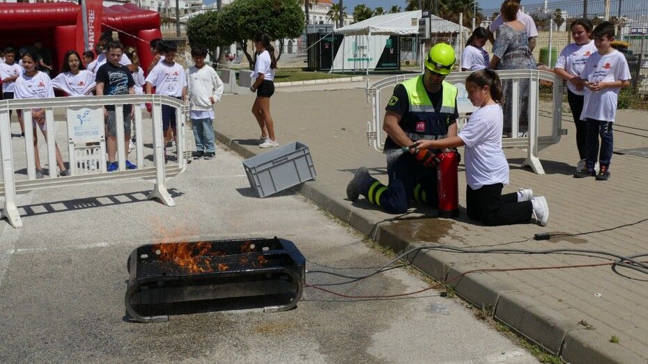 Desde ayer y hasta mañana sábado, un espacio del puerto deportivo de Rota, a la altura de la plaza 470, se ha convertido en recinto en el que aprender sobre prevención de incendios de la mano de unas jornadas que se celebran en la localidad de nuevo este año, organizada por el Ayuntamiento de Rota, la Fundación Mapfre y la Asociación Profesional de Técnicos de Bomberos (APTB), con la colaboración de Protección Civil, la Armada, Policía Local y Policía Nacional. Una iniciativa que durante las mañanas del jueves y hoy viernes ha estado abierta a los escolares de todos los centros educativos a los que se les ofreció la posibilidad de participar, y que mañana sábado, 25 de mayo, se celebrará como una jornada de puertas abiertas.