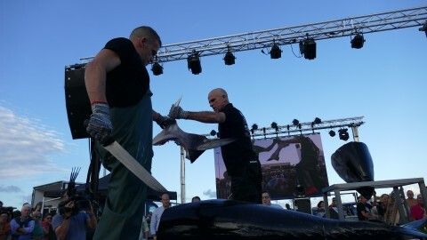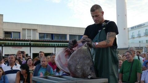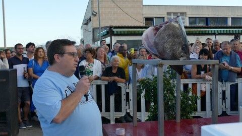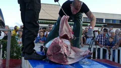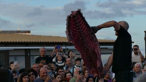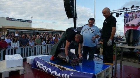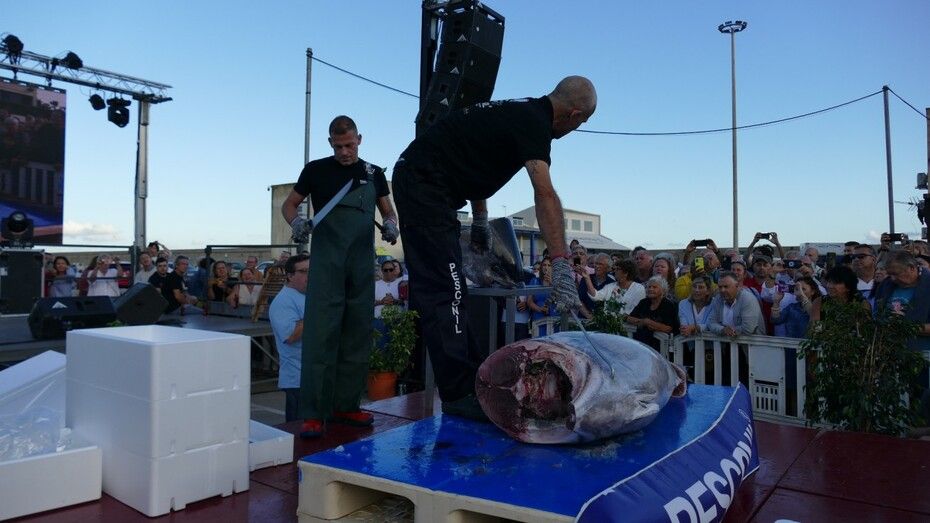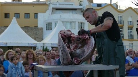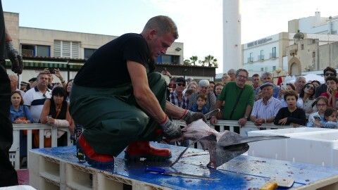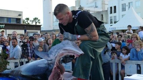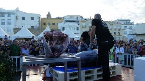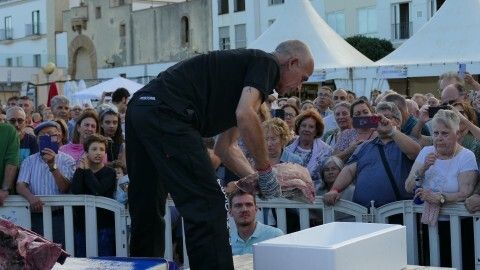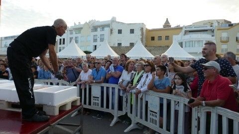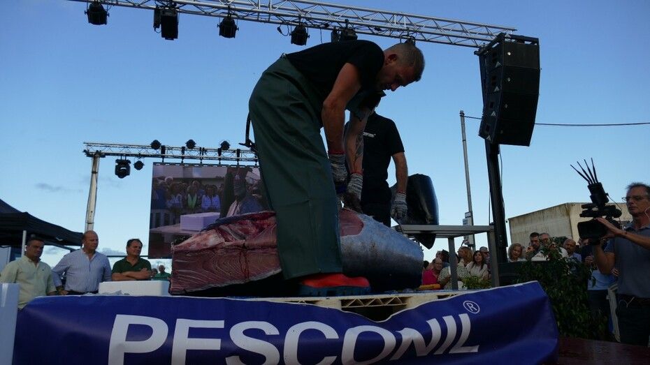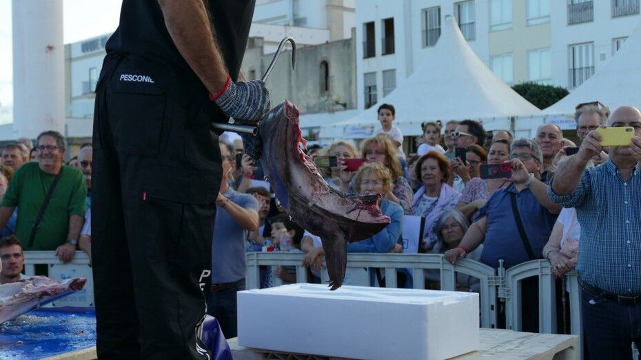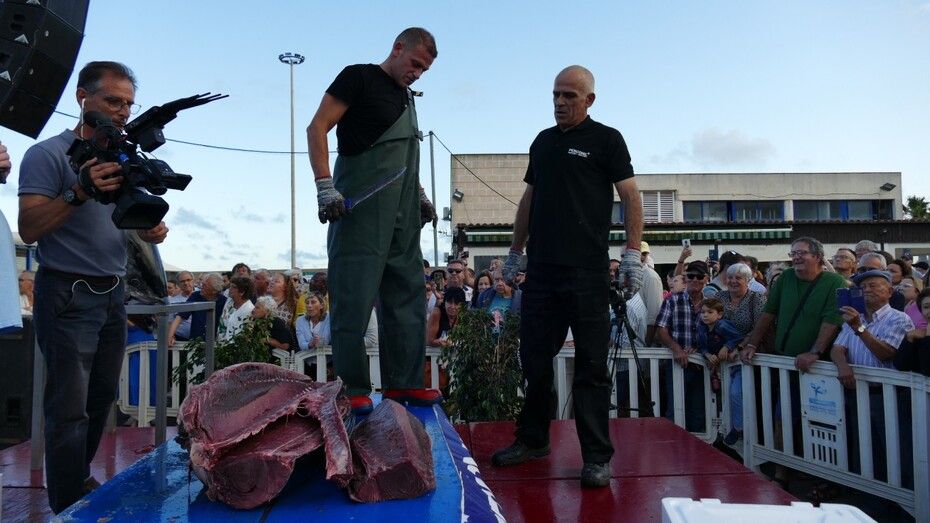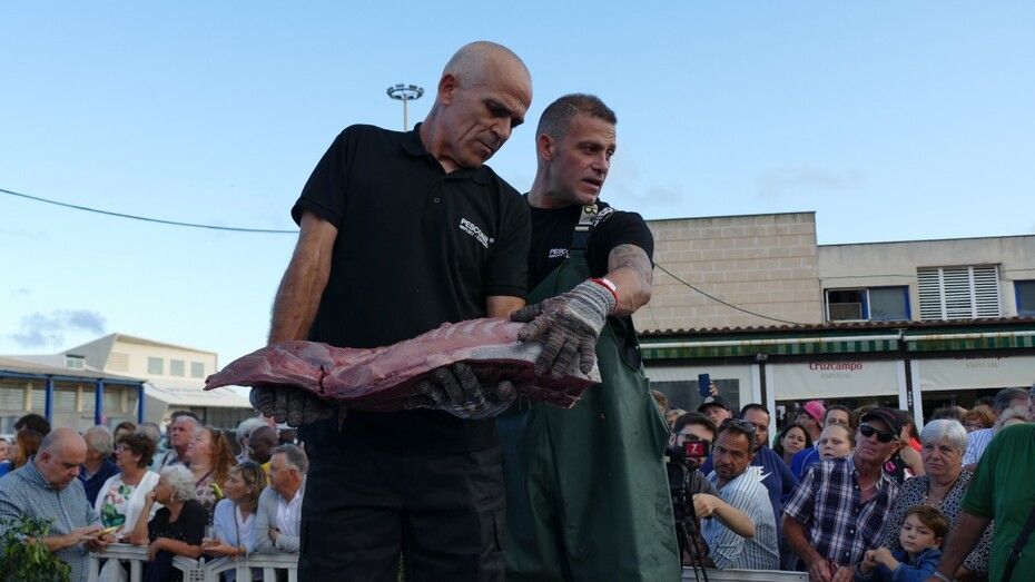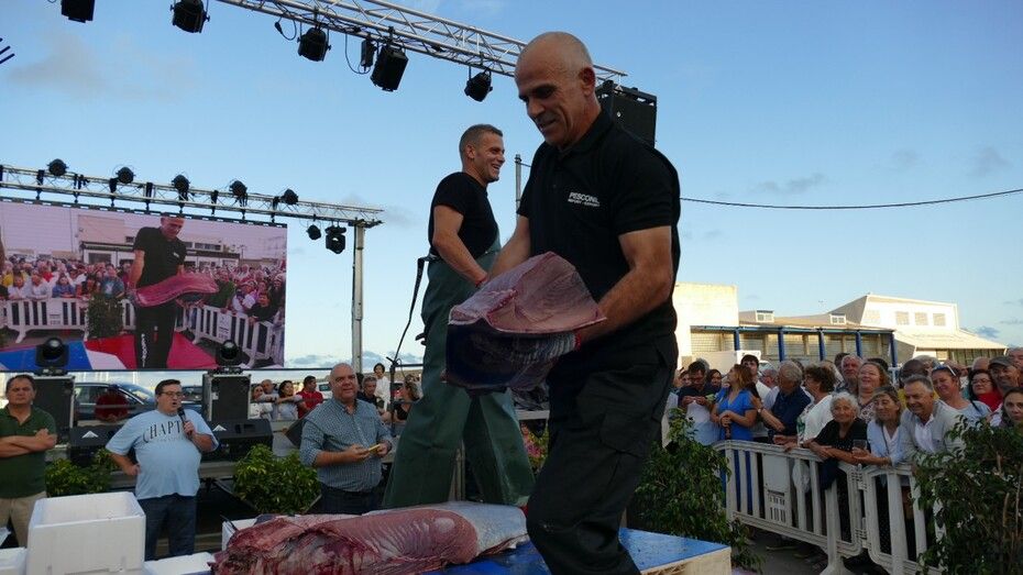Sobre las siete y media de la tarde llegaba al puerto pesquero un atún de unos 156 kilos y una hora más tarde, cuando el público ya estaba congregado en torno al escenario central, ha comenzado el ronqueo. Gracias a una gran pantalla, los asistentes han podido ver detalladamente el despiece del atún y escuchado algunas de las explicaciones que Manuel Delgado, trabajador de Pesconil, ha ido dando a los presentes sobre las características de cada parte porque de este pescado, se aprovecha prácticamente todo.