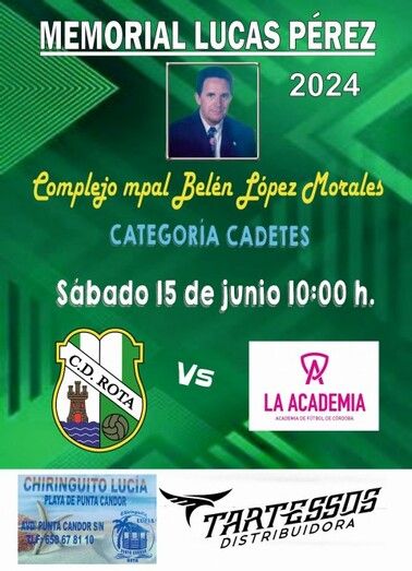 Este año, será el equipo cadete del CD Rota el que se enfrentará al de La Academia de Córdoba, en un partido que siempre está marcado por el buen ambiente y la deportividad, ya que aunque se trate de una competición, el objetivo real, es recordar a Lucas Pérez Segovia, un hombre que siempre estuvo ligado a la catera de la entidad verderona, desempeñando labores de delegado de equipos y durante años, árbitro de fútbol en la subdelegación de Rota. Además, ejerció de delegado de varios equipos de cantera que entrenaba Julián Reales, otra de las personas importantes para el club.