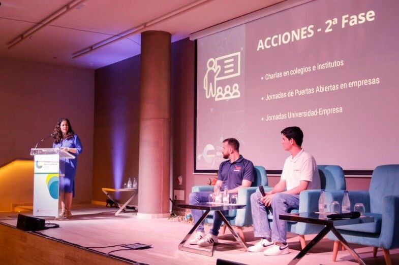 Tras la presentación del contenido de la campaña, se ha dado la palabra a dos jóvenes, Agustín y Javier, como testimonio de la salida profesional del sector. Ellos forman parte del primer grupo de alumnos a los que se ha impartido este curso en el IES Virgen del Carmen de Puerto Real el Curso de Especialización de FP sobre Digitalización del Mantenimiento Industrial, recién implantado por la Junta de Andalucía a petición del Clúster. Han estado compaginando, en modalidad de FP Dual, sus clases en el instituto con prácticas en empresas del Clúster y la mitad de los alumnos están ya trabajando en estas empresas con un contrato profesional.