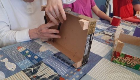 A lo largo de los nueve meses que ha durado el taller, las personas que han participado en las sesiones han podido ir creando diferentes propuestas visuales y materiales a partir de material de desecho, entre ellos los hoteles de insectos, elaborados a partir de cajas de fresas.