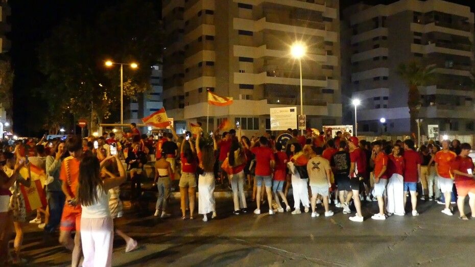 A las 23.15 horas, una larga comitiva de jóvenes caminaba por la avenida de la Marina hacia Virgen del Mar y allí, han reventado. Se han mojado, aunque la fuente estaba apagada, se han quitado las camisetas, han saltado, han cantado y han disfrutado con la alegría que les ha dado La Roja. En el meollo, en plena fuente, chavales de entre 13 y 20 años celebrándolo por todo lo alto, y en torno a la fuente, en las aceras, algo más calmados, los más adultos que, uniéndose a la fiesta, lo hacían a otro ritmo.