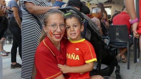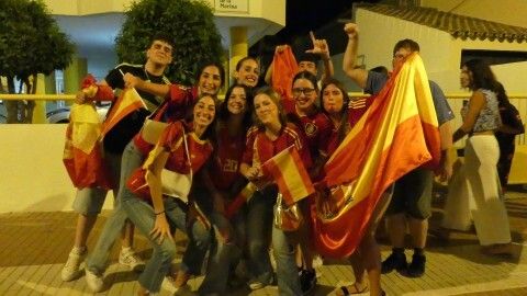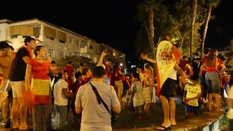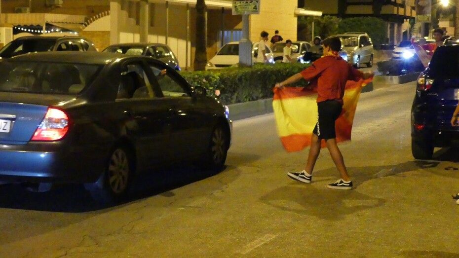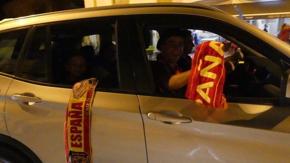 Banderas de España en balcones, colocadas a modo de capa, pintadas en la cara, en bufandas, en pequeño formato y mucha camiseta roja se ha visto en la tarde noche de un domingo que es probable que para muchos, los más jóvenes, se prolongue.