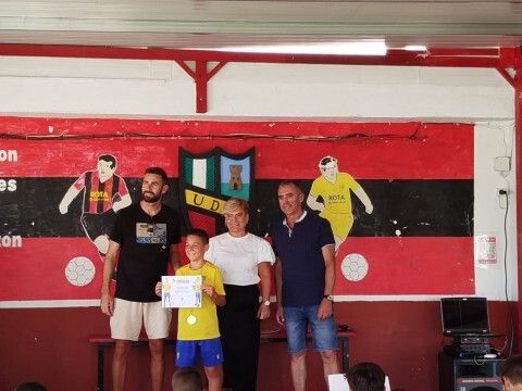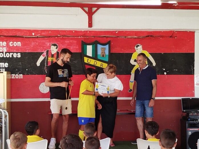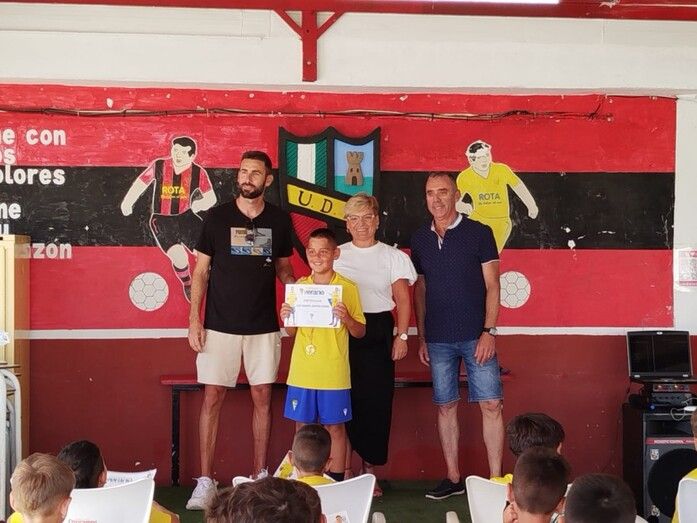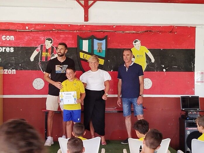 La delegada municipal de Deportes, Luisa Fernández, asistió invitada a la clausura del campus y acompañó al presidente de la UD Roteña, Manuel Santamaría, y a Jose Mar,i exjugador del Cádiz, en la entrega de diplomas y medallas a los participantes en esta propuesta deportiva que ha reunido a un buen número de niños de entre 5 y 14 años de edad.