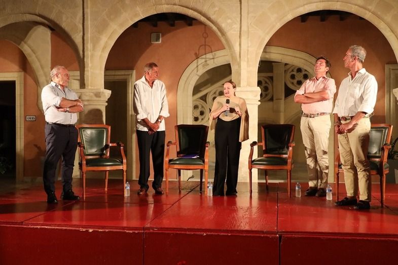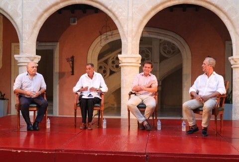 Eduardo Dávila Miura, teniente Hermano Mayor de la Hermandad de la Macarena de Sevilla; Pedro Pérez Rodríguez, Hermano Mayor de la Hermandad de las Tres Caídas de Jerez; y Manuel León Carmona, teniente Hermano Mayor de la Hermandad del Gran Poder de Sevilla, tomaron parte en esta interesante tertulia que fue seguida con gran interés por parte del público presente en el patio del Palacio Municipal Castillo de Luna.