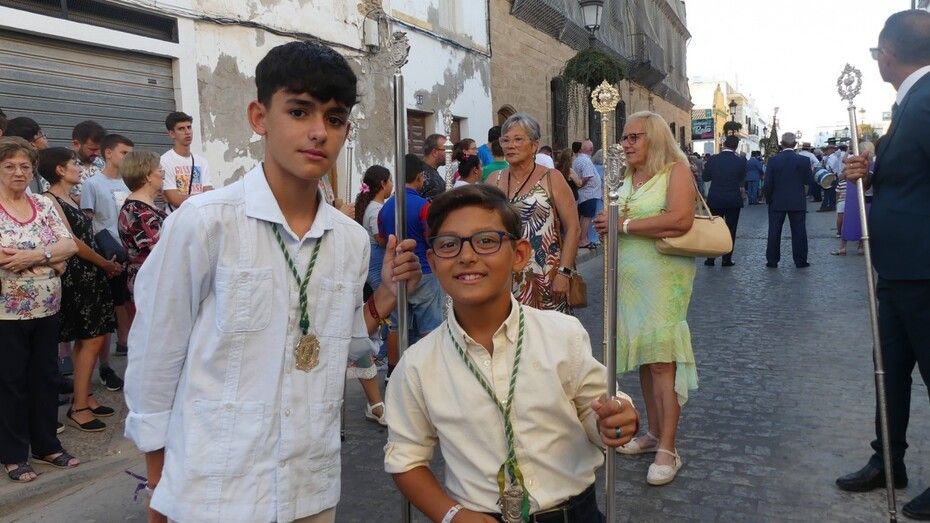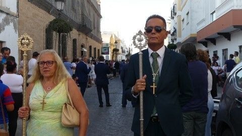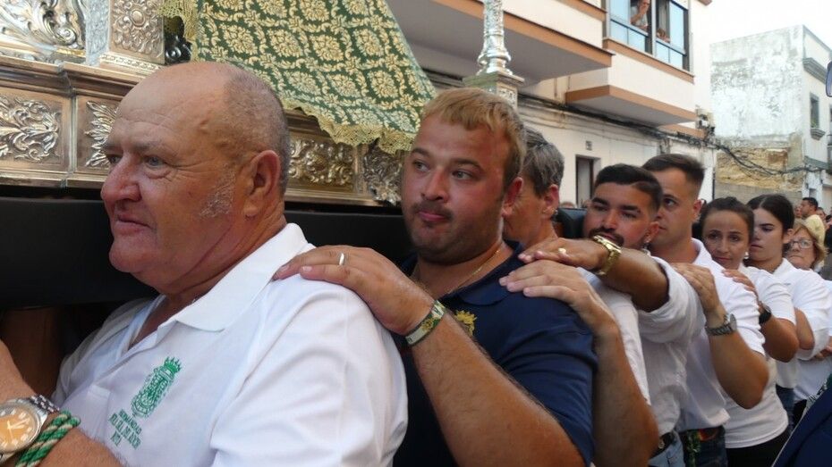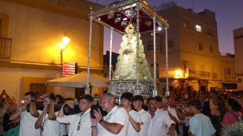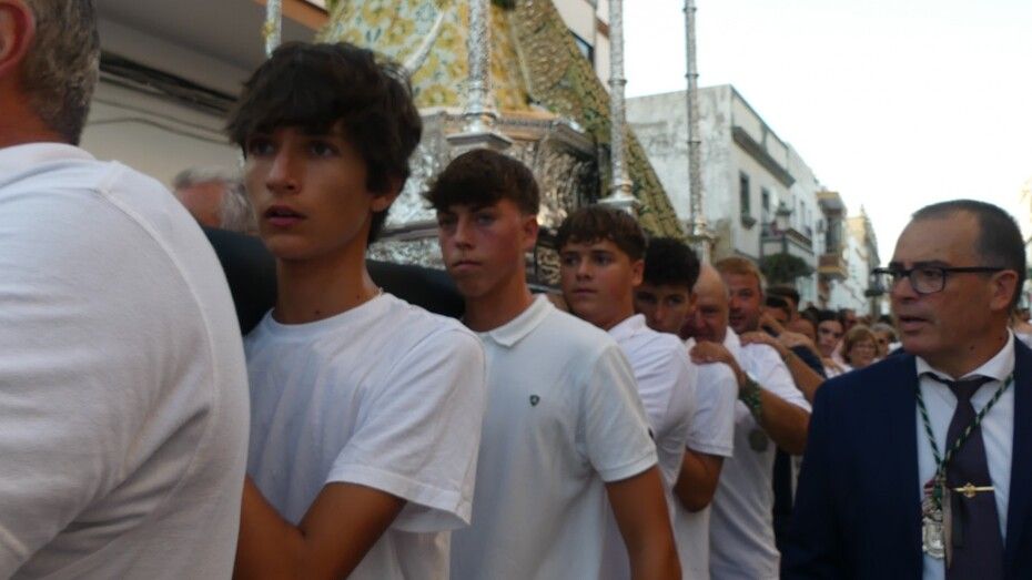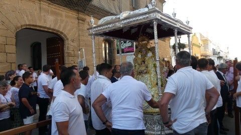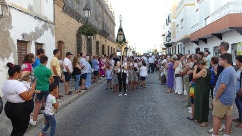 Una imagen que luce espléndida y que hasta pasada la medianoche estará por el casco histórico de la villa recibiendo, como lo ha hecho casi desde el principio, vítores y cantos dedicados por espontáneos que han querido lanzar sus plegarias. Sevillanas, 'vivas' y pitos rocieros se han escuchado en esta salida procesional que partía a las 20.30 horas con una cuadrilla compuesta por hermanos rocieros de Rota y de Sanlúcar, que la van portado en sus hombros como señal de fe. Al mando, el capataz Alfonso García de Quirós, marcando el paso.