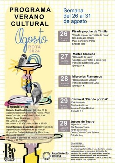 La Delegación municipal de Cultura, que dirige la teniente de alcalde Encarna Niño, ha recogido en un solo cartel las propuestas de esta semana de agosto, en la que también se incluyen dos exposiciones: la muestra colectiva de pintura de Ángel de la Custodia, Juan Quirós, Lokati, José Basto y Tosar Granado, abierta en la sala del Castillo de Luna; y por otro lado la de Manuel Organvídez Carbellido, que se puede visitar en la sala intermodal de Costa Ballena.