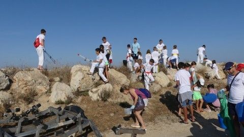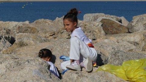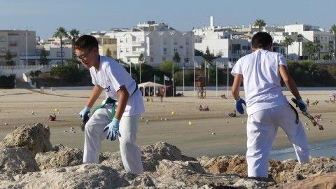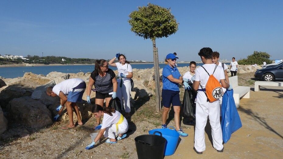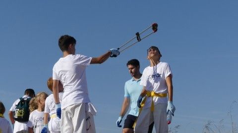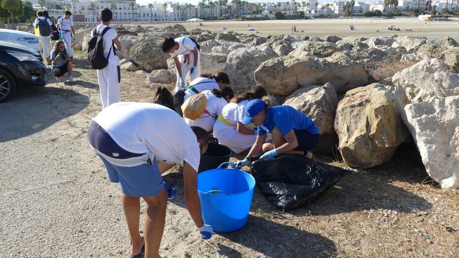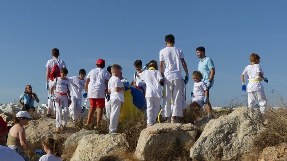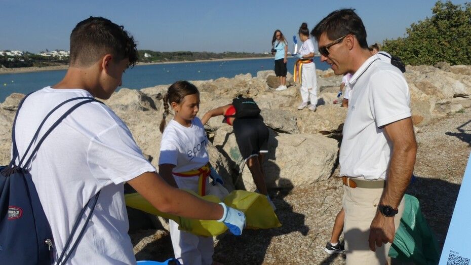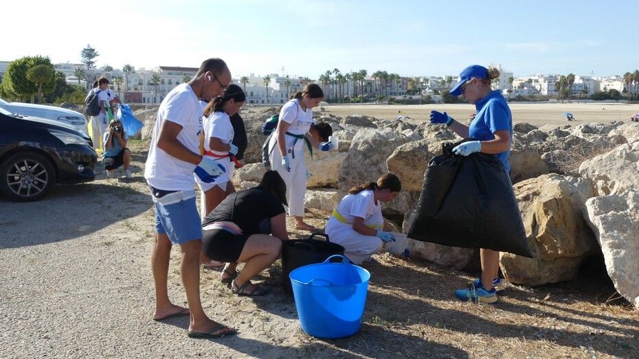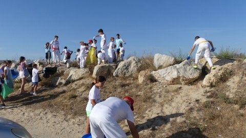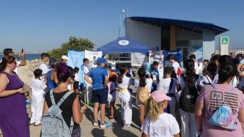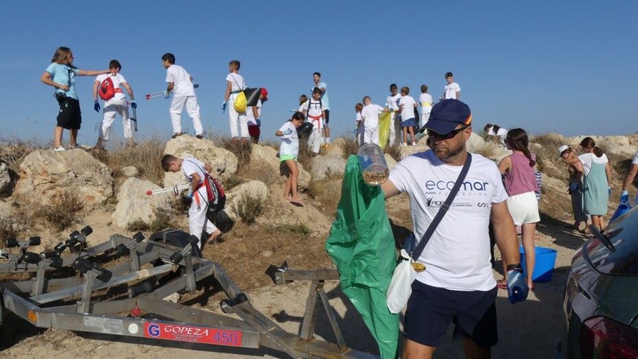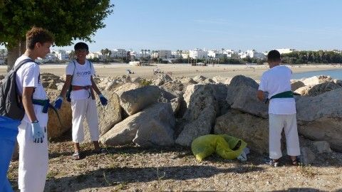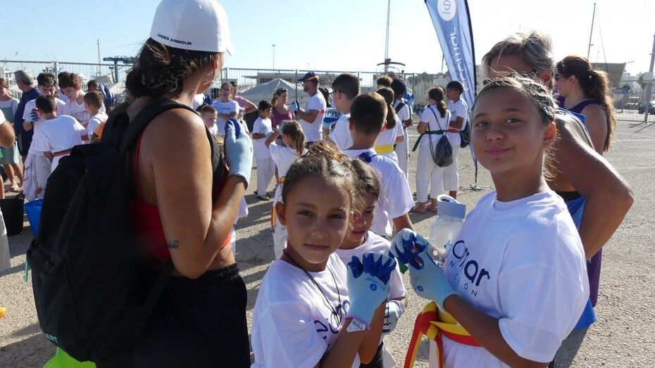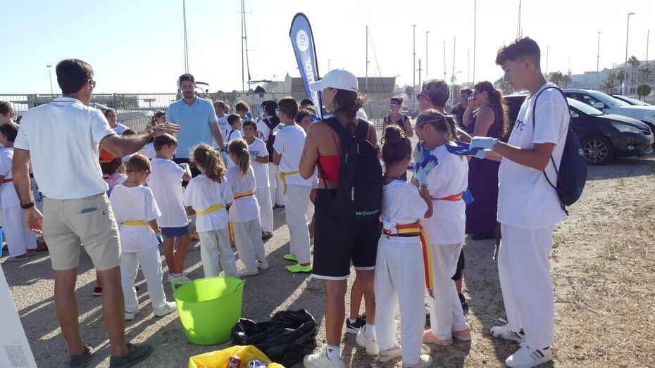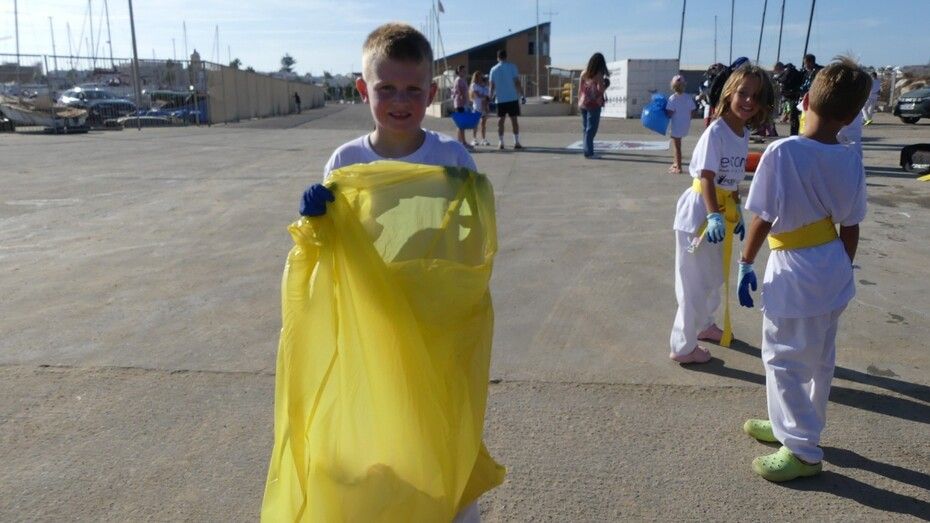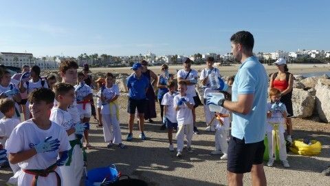 Los chicos de la escuela municipal de kárate han sido hoy los colaboradores activos que han puesto su granito de arena para retirar basuras del entorno de la escuela de vela y con ello, evitar que acaben en el mar.