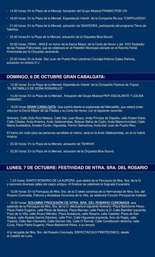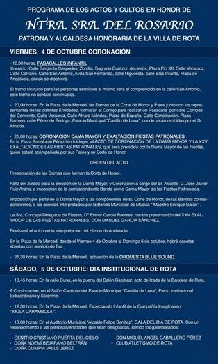 Esa será la antesala de uno de los actos claves de estas fiestas patronales, la elección y coronación de la dama mayor del Rosario, que será elegida de entre las 22 damas, representantes de peñas y entidades locales que partirán a las 20.00 horas desde la plaza de la Merced. En un paseíllo andando hasta la plaza Bartolomé Pérez, pasando por las calles Compás del Convento, Veracru, Álvaro Méndez, plaza de España, Constitución, plaza Barroso y Pérez de Bedoya, las damas del Rosario y sus acompañantes junto a los pajes llegarán al Castillo de Luna donde, en la puerta, las recibirá el alcalde de Rota, Javier Ruiz, junto a la Corporación municipal.