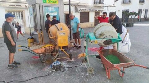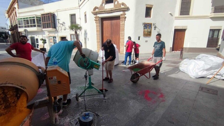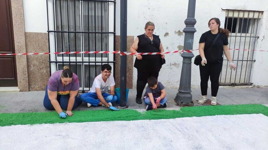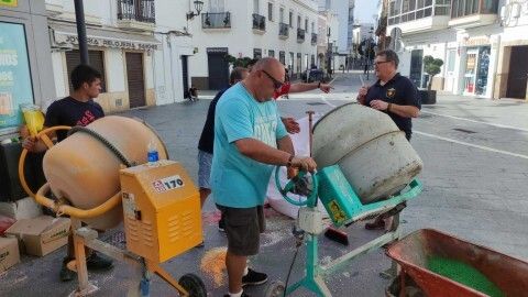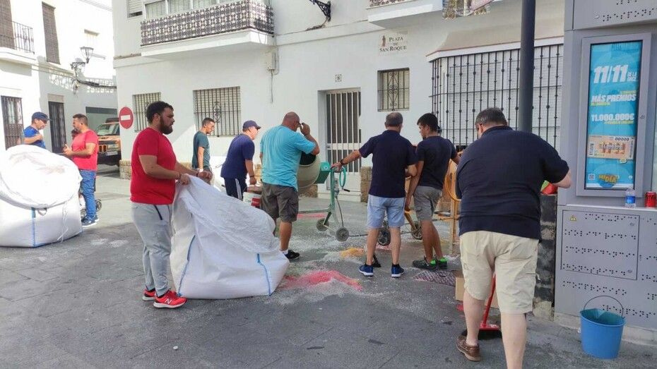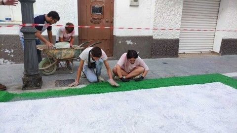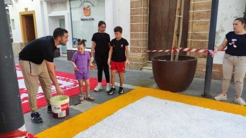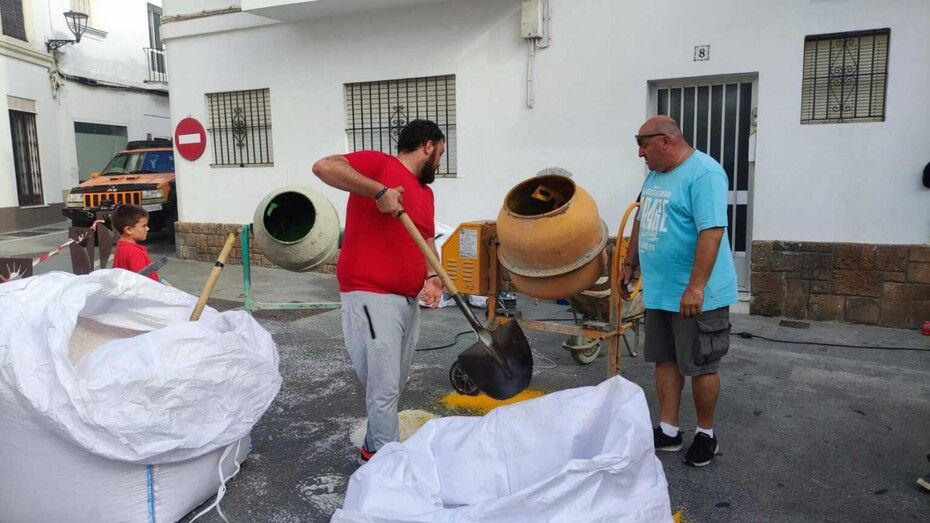 Mientras en la plaza de San Roque miembros de hermandades y del Consejo Local van preparando la sal, tintándola y vaciándola en carretillas, otros la van transportando y dejándola en los puntos en los que los grupos de jóvenes sobre todo, van dándole forma con unas plantillas que ayudan en esta tarea.