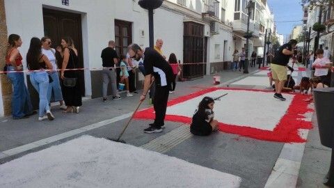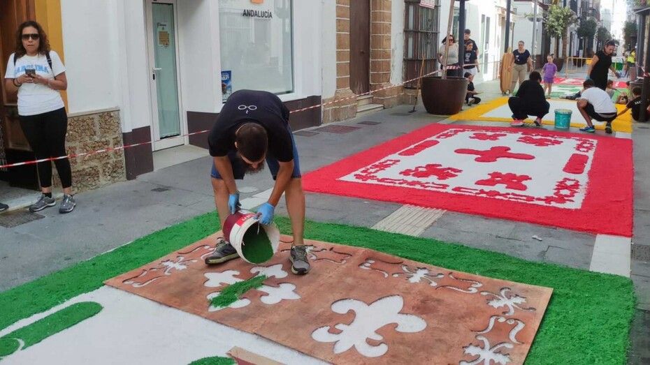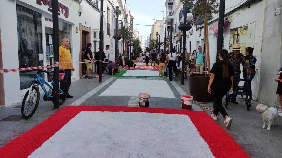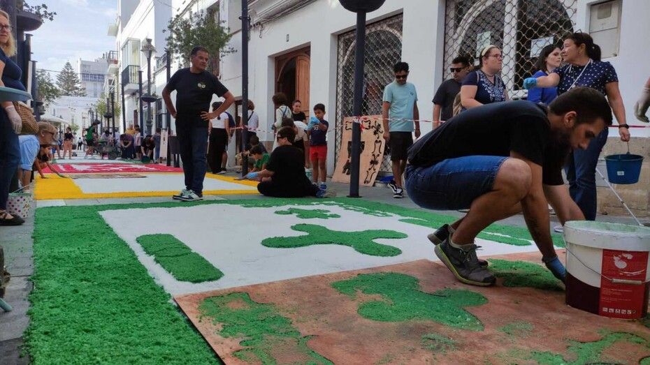 Unos 5.500 kilos de sal traídos de la salinera de Bonanza, a través de la empresa Sal Chalupa, están sirviendo para que en la tarde de este domingo, el suelo de la calle García Sánchez se vaya transformando en una vistosa alfombra de colores. Aunque la idea principal es que la alfombra llegará hasta un tramo de la calle Castelar, es probable que la falta de sal impida que se prolongue. En cualquier, caso, hasta que no avance la tarde no se podrá calcular con más exactitud. De todas maneras, las partes que queden decoradas lo harán dejando una estampa vistosa como ya se puede apreciar en el inicio de la calle García Sánchez donde los dibujos van quedando fijados.