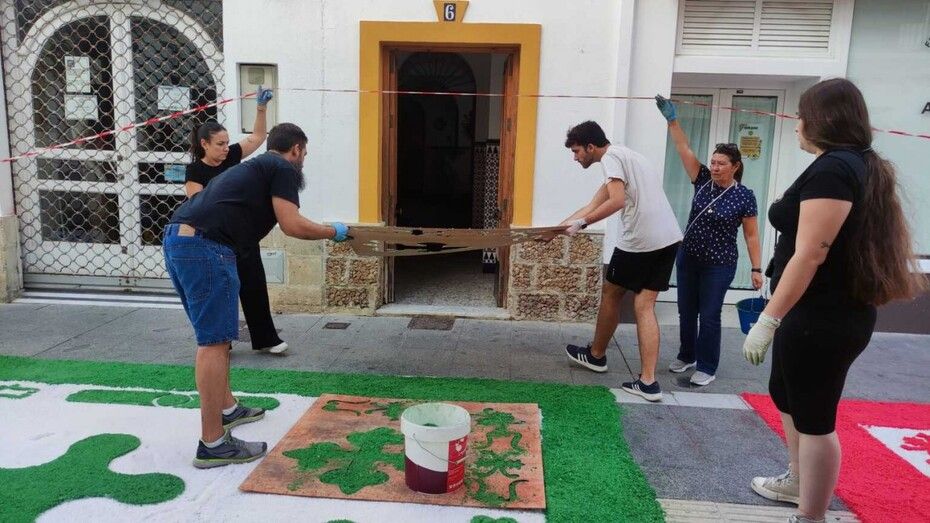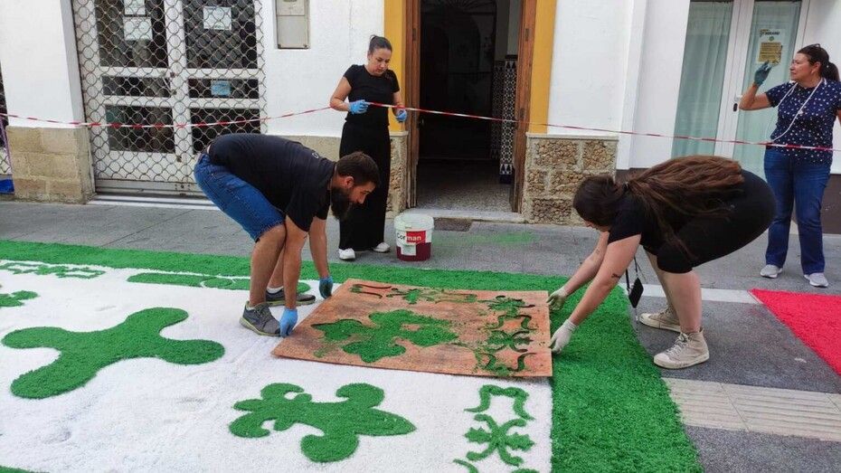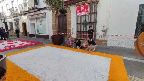 Desde las tres de la tarde, la calle García Sánchez y la plaza de San Roque están siendo el punto de encuentro en el que muchos niños y miembros de casi todas las hermandades de Rota están trabajando para realizar una alfombra de sal que sirva para engalanar el paso de la virgen Nuestra Señora del Rosario. Es una iniciativa que partió del Consejo Local de Hermandades y Cofradías y que ha tenido muy buen respaldo con muchos niños y jóvenes participando guiados por miembros de hermandades que se han implicado en esta actividad.