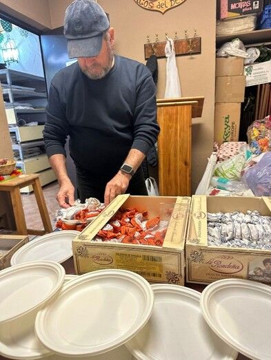 Voluntarios ayudan al Mayor a preparar la caseta 'El Taxi - Amigos del Deporte' para una merienda navideña muy esperada