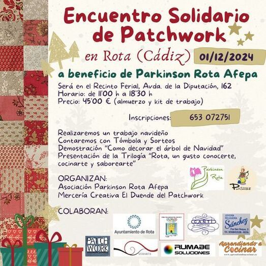 El evento fue posible gracias al trabajo conjunto entre Parkinson Rota (Afepa) y la mercería creativa 'El Duende del Patchwork', con el respaldo del Ayuntamiento de Rota y la colaboración de diversas empresas locales, como 'Canti Catering', 'Verarte', 'Rumabe Soluciones', 'Aprendiendo a Cocinar' y 'Joyería Sánchez'.