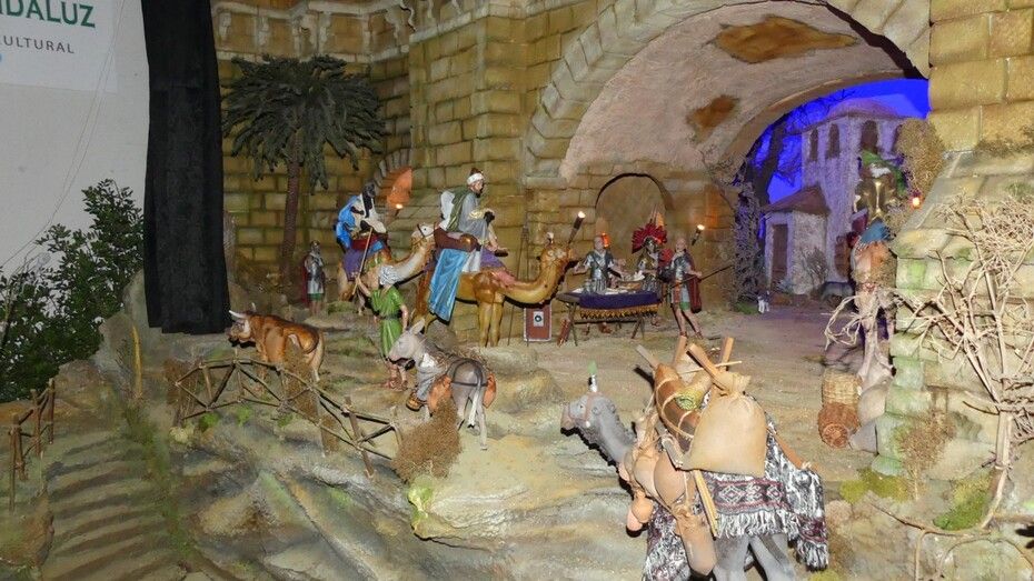 Los belenistas este año han optado por recrear la entrada de un castillo a un pueblo hebreo custodiada por romanos. En él se ve el misterio del nacimiento de Jesús con unas figuras que son nuevas diseñadas exclusivamente para la asociación, que cumple su 15 aniversario, y que son obra del artista jerezano Joaquín Pérez, además, se estrenan los romanos y la cabalgata.