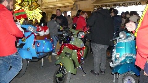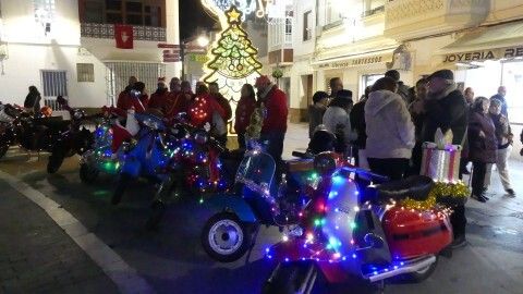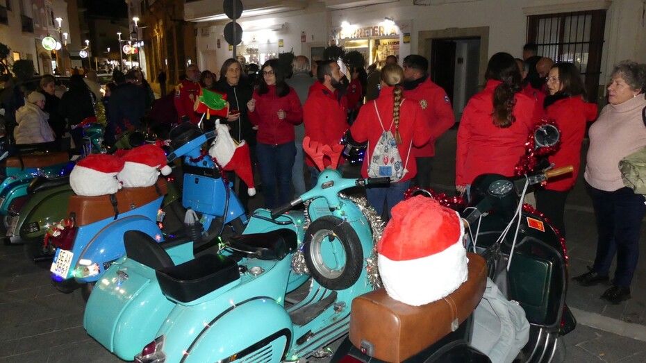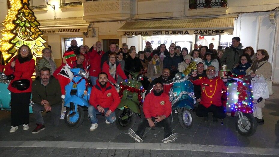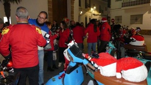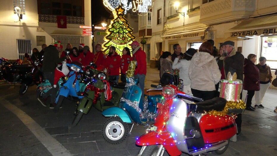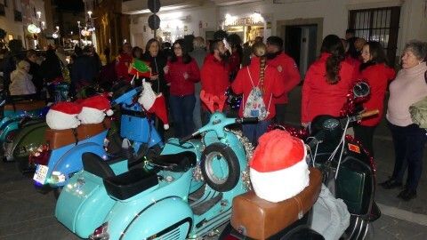 Han pasado cinco años, y lo que fue una iniciativa ante la coyuntura de la crisis sanitaria, se ha asumido como una actividad más del calendario local navideño de este club y esta tarde de sábado, una quincena de socios del Vespa Club Rota, han salido a la calle. Todos se han enfundado el color rojo en la chaqueta, se han colocado algunas luces, gorros de Papá Noel y han repartido caramelos a los niños desde unas vespas igualmente decoradas para la ocasión.