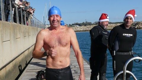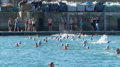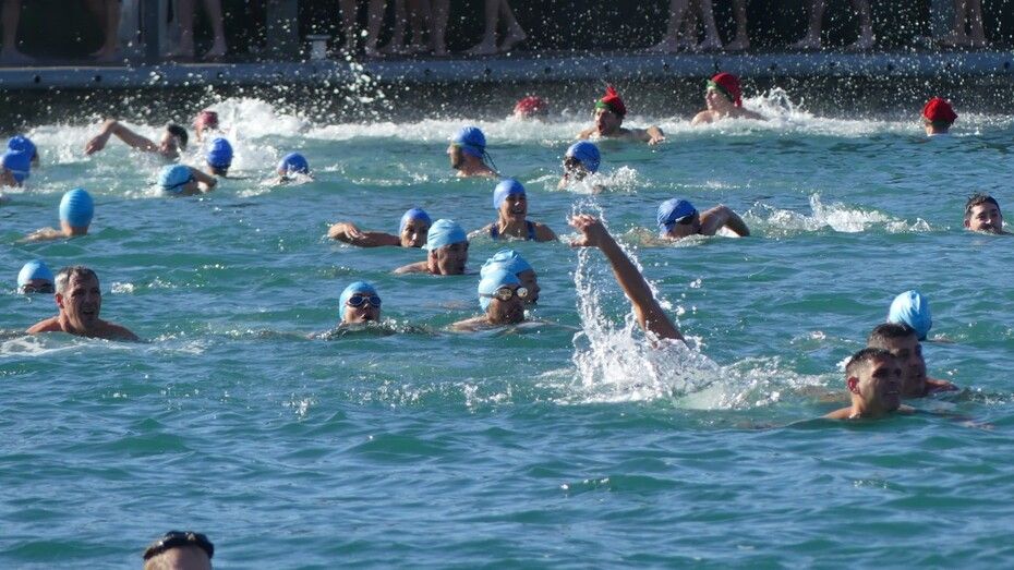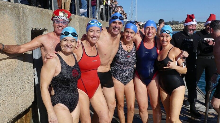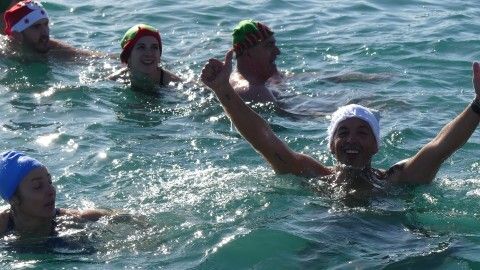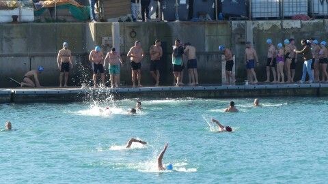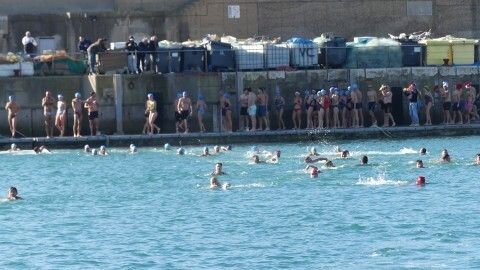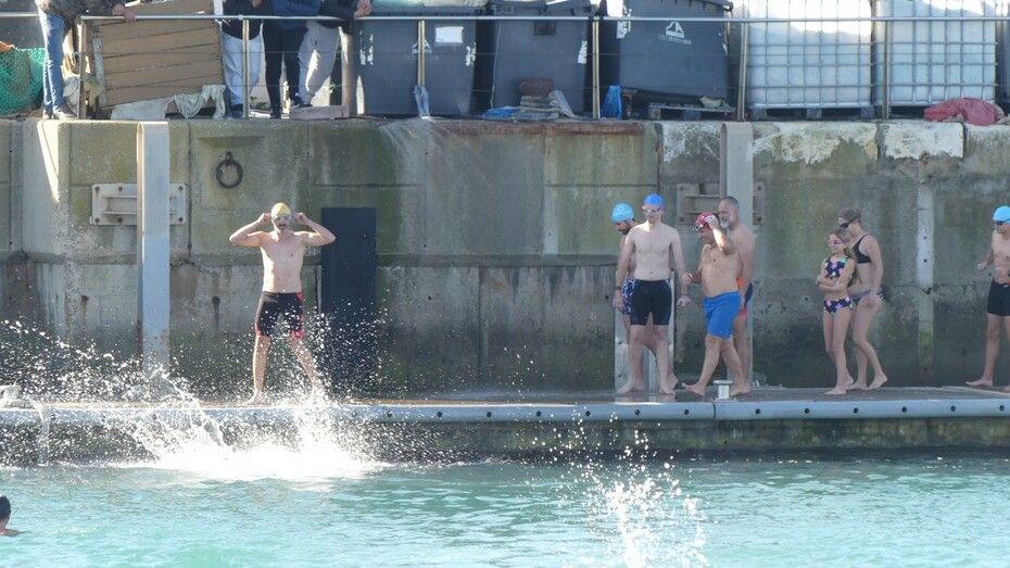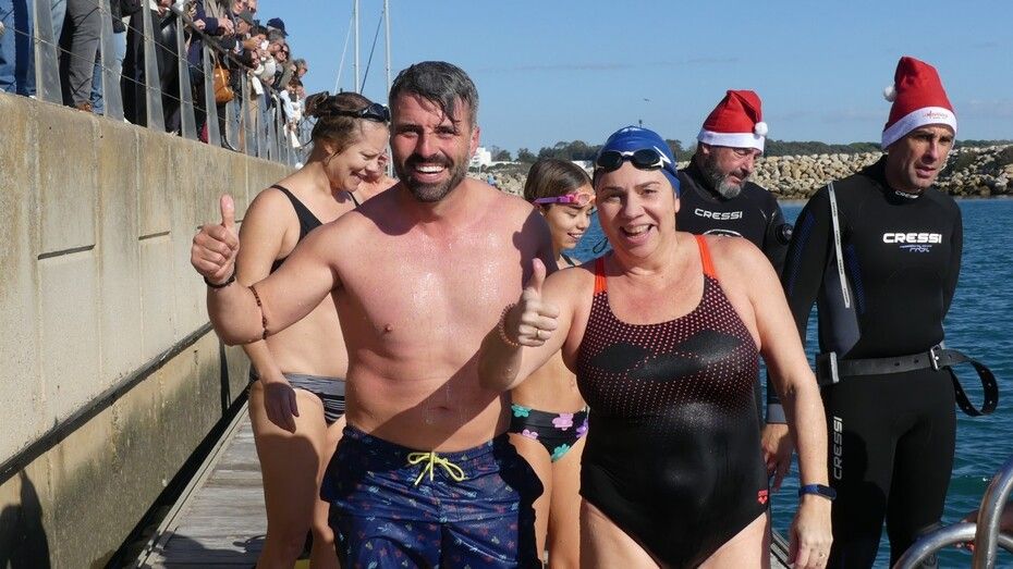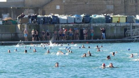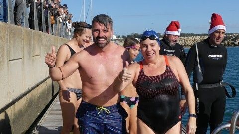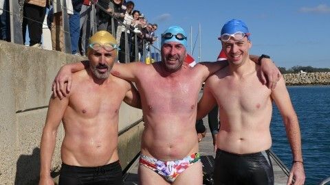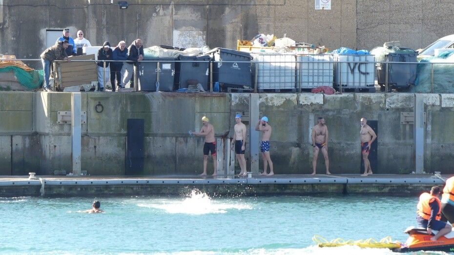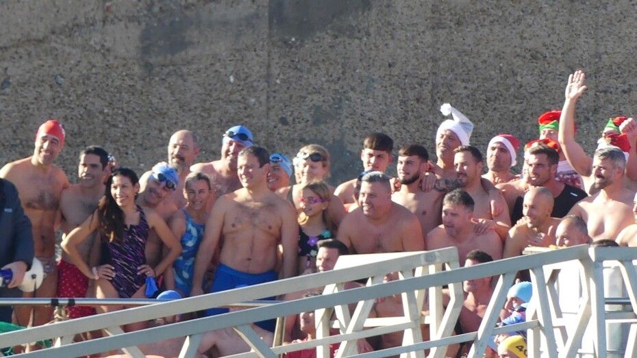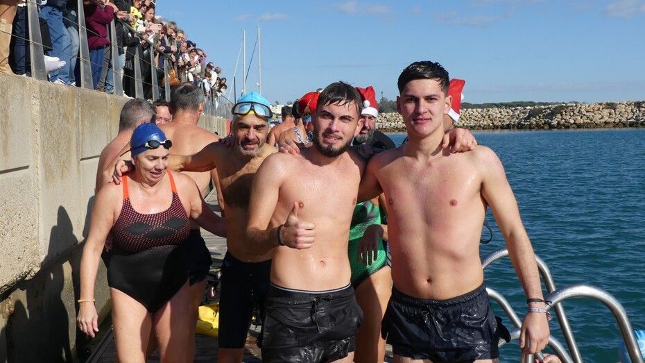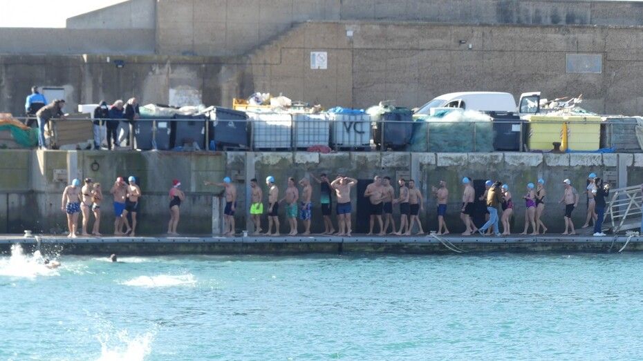 Los 100 metros de distancia que se recorren a nado, hasta el pantalán del catamarán, donde esperan amigos y familiares, es un recorrido que para muchos se hace corto y que alargan haciendo del baño un momento de festivo y de diversión pese a las bajas temperaturas.