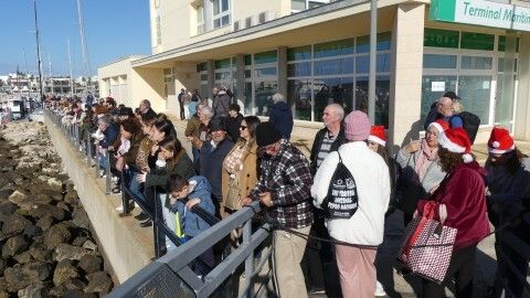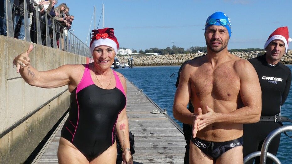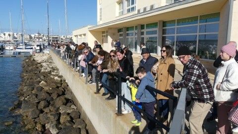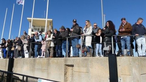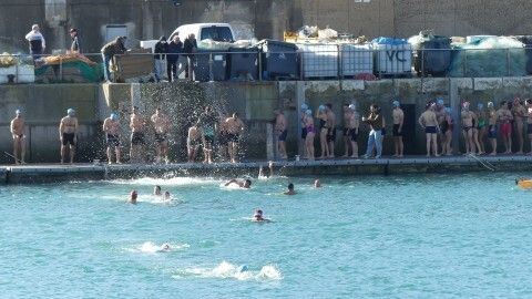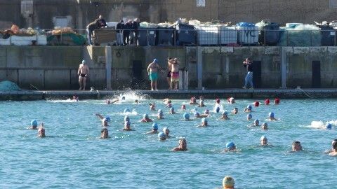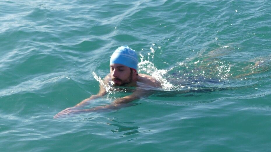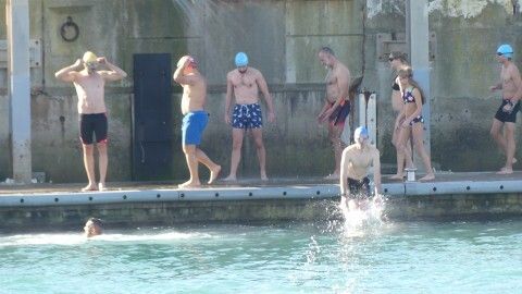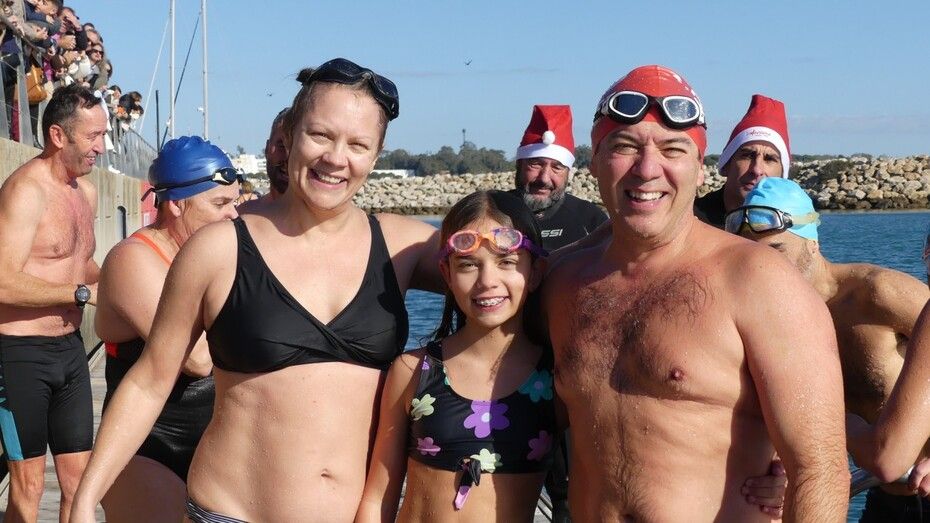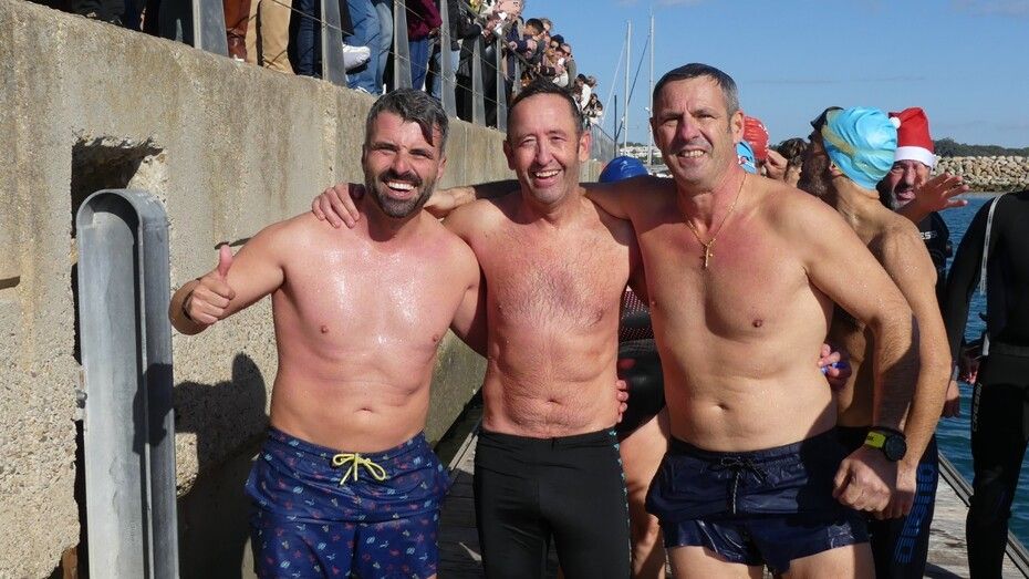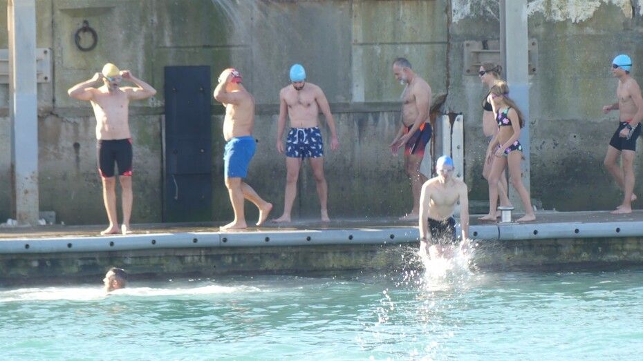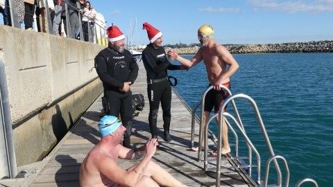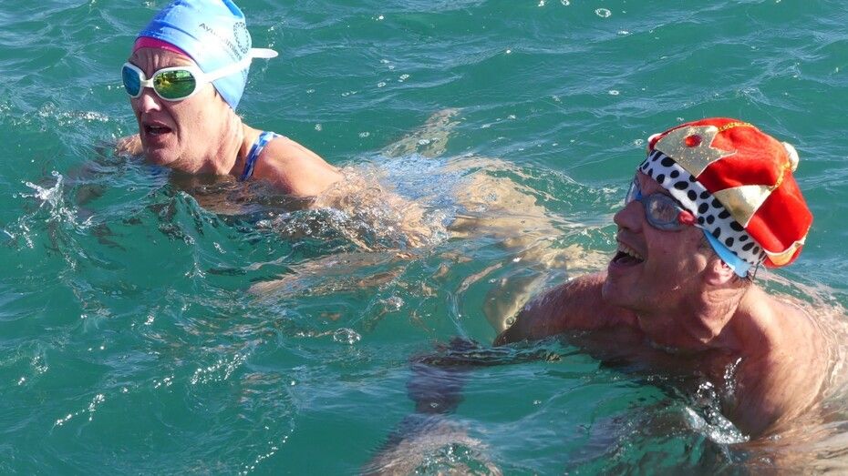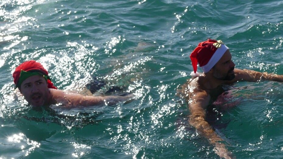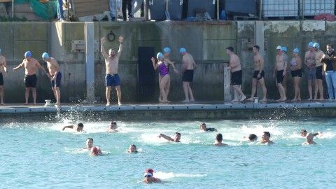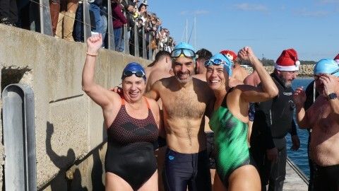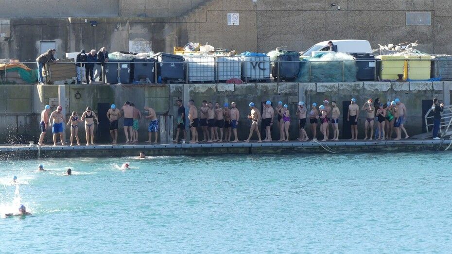 Los 100 metros de distancia que se recorren a nado, hasta el pantalán del catamarán, donde esperan amigos y familiares, es un recorrido que para muchos se hace corto y que alargan haciendo del baño un momento de festivo y de diversión pese a las bajas temperaturas.