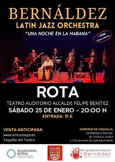 La diversidad de propuestas continúa el 25 de enero a las 20.00 horas, cuando la Bernáldez Latin Jazz Orchestra ofrecerá 'Una noche en La Habana', un espectáculo lleno de ritmo y sabor cubano. Los asistentes podrán disfrutar de un viaje musical que trasladará al público a Cuba, donde su conguero y cantante natural de La Habana, Samuel Aguilera, les guiará a través de las historias y anécdotas curiosas del repertorio y sus autores. Las entradas, disponibles por 15 euros, pueden adquirirse de forma anticipada en http://www.entradasya.es.