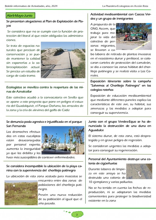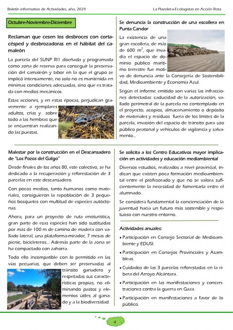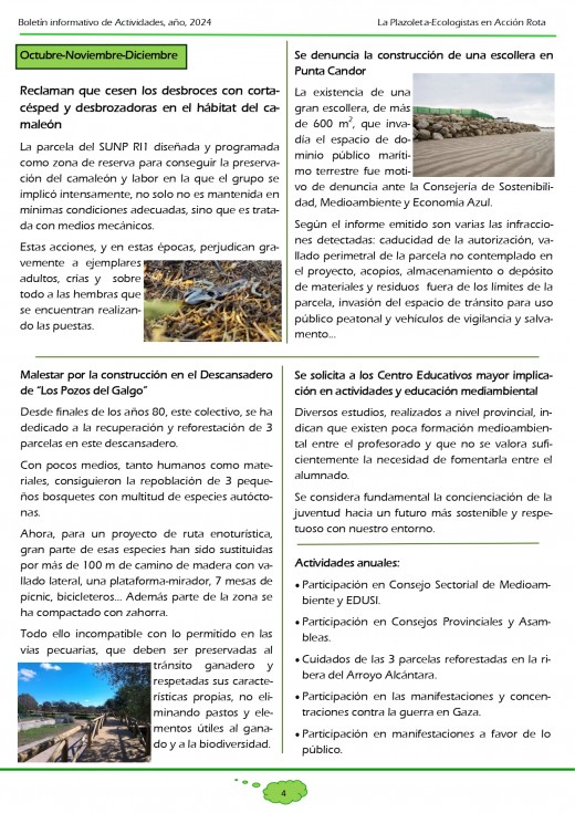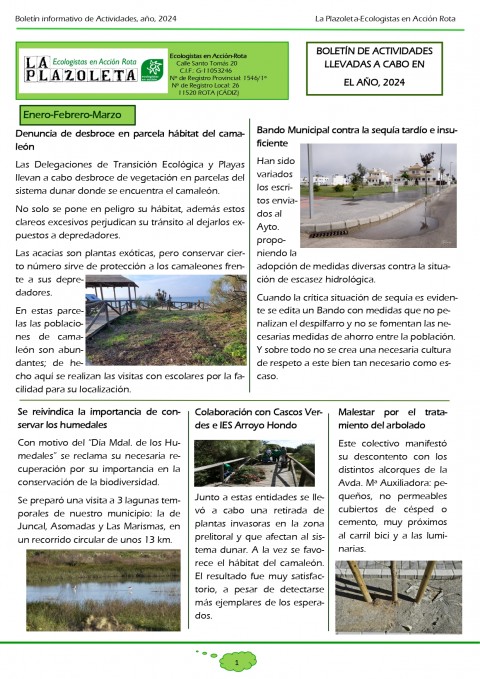 Terminado el año 2024, y como es habitual, Ecologistas en Acción - La Plazoleta ha hecho balance de las actividades que han desarrollado y han mostrado su compromiso de seguir trabajando en la defensa del entorno natural en Rota y en la provincia.