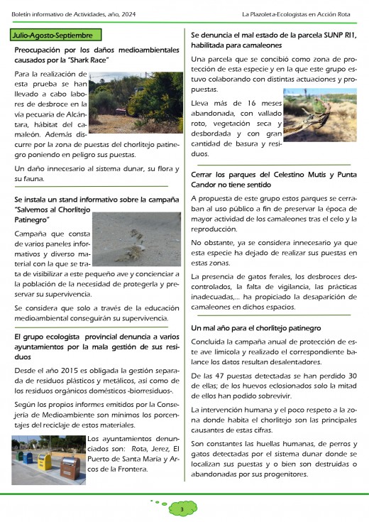 Los ecologistas lamentan que aunque hay una normativa al respecto para la protección de ambas especies, las administraciones públicas siguen incumpliéndolas y mirando hacia otro lado, por lo que creen que su labor sigue siendo necesaria. Por otro lado, en Rota continuarán con las labores de reforestación en las riberas del arroyo Alcántara, donde ya han conseguido en estos últimos cuatro años, llevar actuaciones de repoblación con especies autóctonas en tres espacios.