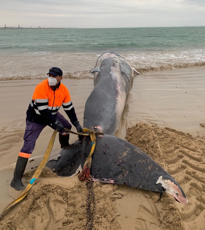 Una ballena muerta (Balaenoptera physalus) , en alto grado de descomposición, ha aparecido varada esta mañana en la playa del Chorrillo y desde la delegación de Playas del Ayuntamiento de Rota se está actuando para intentar sacarla de la zona de la orilla donde ha quedado.