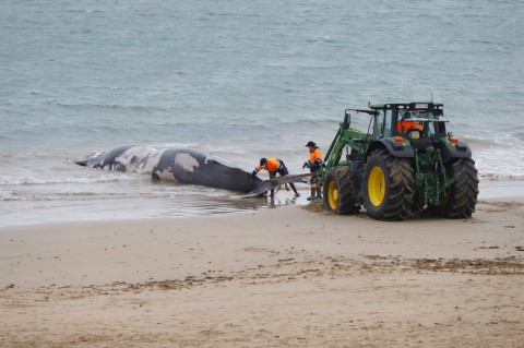 La dificultad está siendo alta no solo por la envergadura del mamífero, de unos 13-14 metros de largo y toneladas de peso, sino porque está justo en el rompeolas, lo que hace más difícil el trabajo.