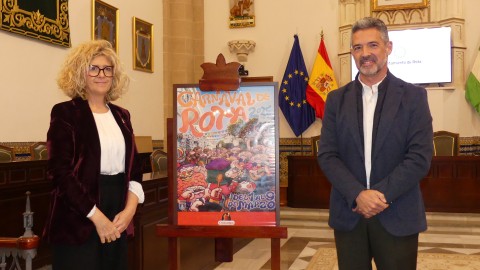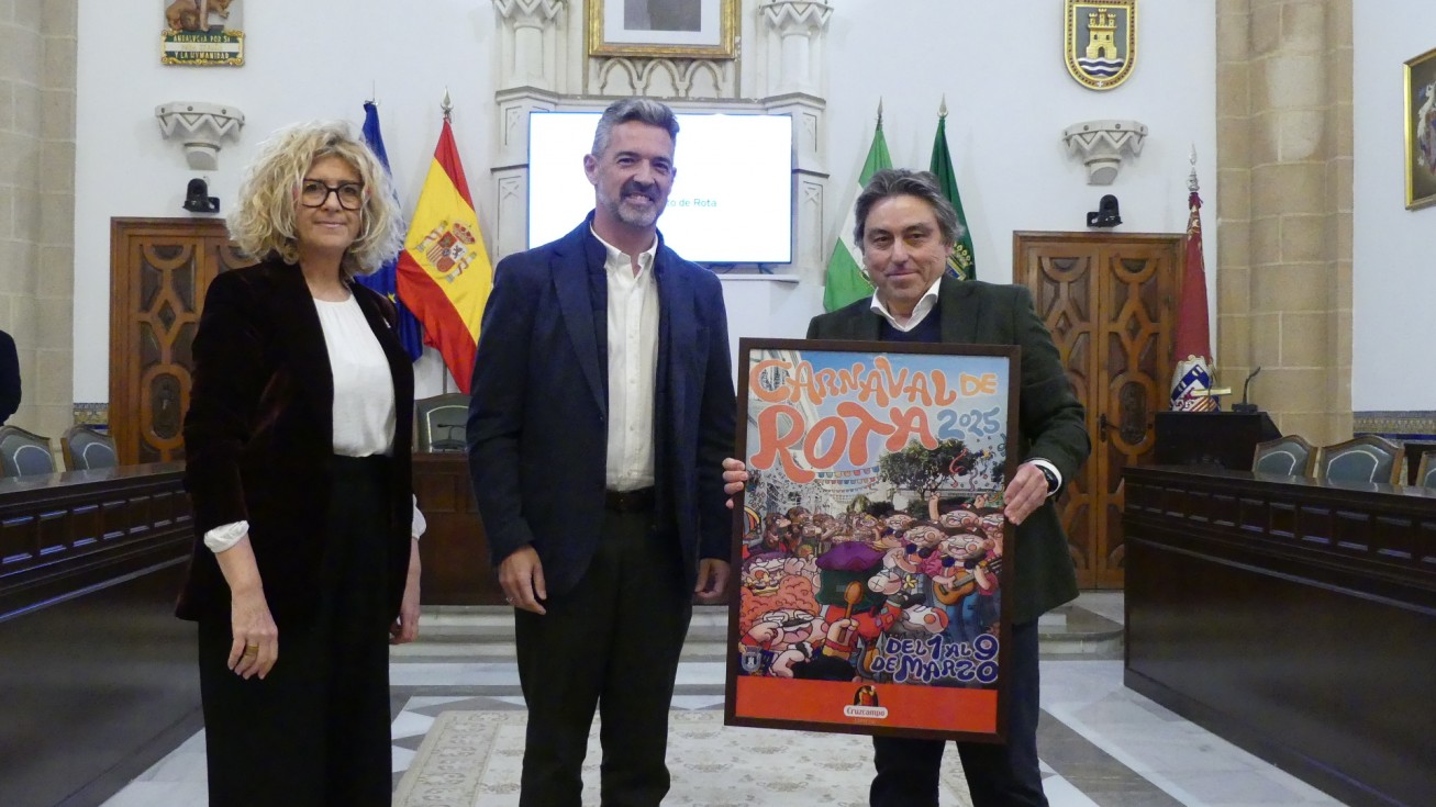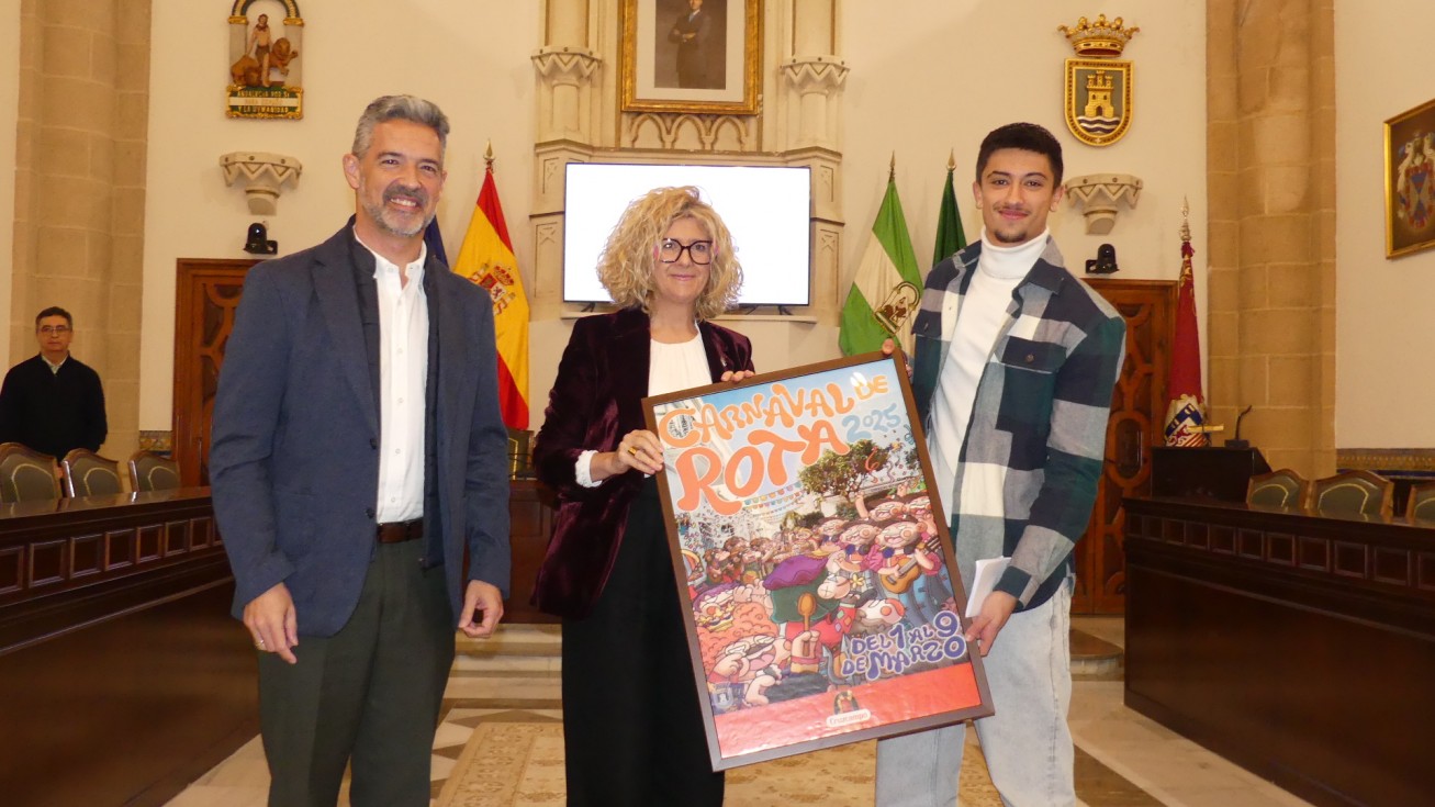 En un salón capitular del Palacio Municipal Castillo de Luna lleno de público, se ha descubierto el cartel anunciador, obra de Elena Hermida Medina, ganadora del concurso convocado por la delegación de Fiestas para este fin, que representa una calle Mina, punto emblemático de encuentro en el Carnaval, llena de alusiones a carnavaleros que han destacado por su aportación, desde el Cuarteto de Rota, a Antoñín y su coro, a Francisco Gutiérrez 'Guti', Rafael Chacón, la comparsa de La Niñas con diferentes tipos, Rosa Gatón, la chirigota de Antoñito Molina e Iván Herrera, a Javier Ros con su cámara inmortalizando momentos y otros. Todos en un ambiente de alegría y papelillos bajo el título de 'Soniquete roteño al compás de la calle Mina' que la autora ha esbozado concentrándolo todo en la frase "Carnaval del pueblo para el pueblo". Con este homenaje sencillo a la fiesta de Don Carnal, se presenta este 2025 la fiesta de febrero por antonomasia, aunque este año, el calendario la retrasa del 1 al 9 de marzo. Elena Hermida Medina ha pedido al Ayuntamiento de Rota que se enseñe a las nuevas generaciones quiénes fueron los que defendieron incluso en tiempos difíciles esta fiesta, para no olvidar que la tradición carnavalera necesita del cuidado de todos para que no se pierda y cada febrero resurja con fuerza.