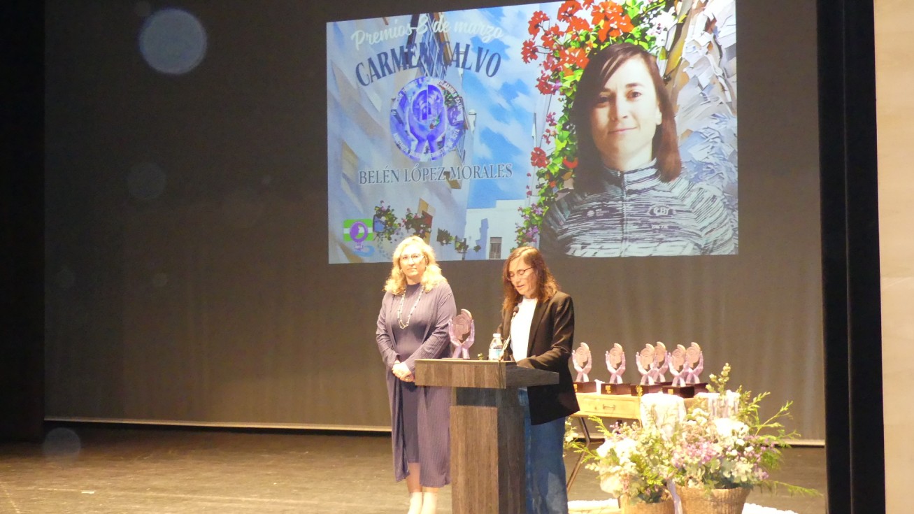Tras felicitar igualmente a las homenajeadas, se pasó a la entrega de galardones a las mujeres elegidas este año como ejemplo. La primera en subir al escenario fue la ciclista roteña Belén López Morales, una deportista que reconoció que cuando se interesó por el ciclismo, solo tenía como referente a hombres. Tardó tiempo en conocer a una ciclista francesa que su padre le decía que "lo ganaba todo" y por eso, en este foro, hoy aprovechó para enviar un mensaje sobre la importancia de que las niñas tengan referentes femeninos en todos los ámbitos.