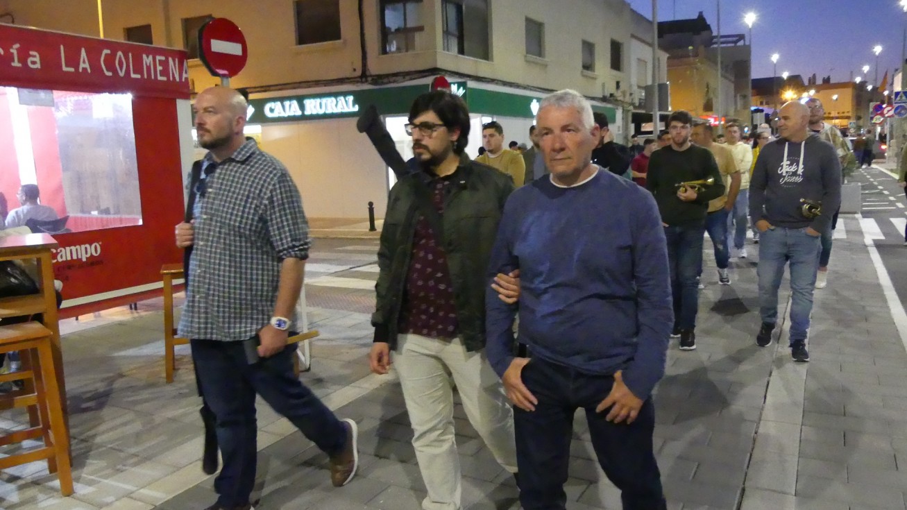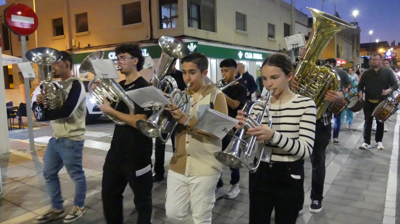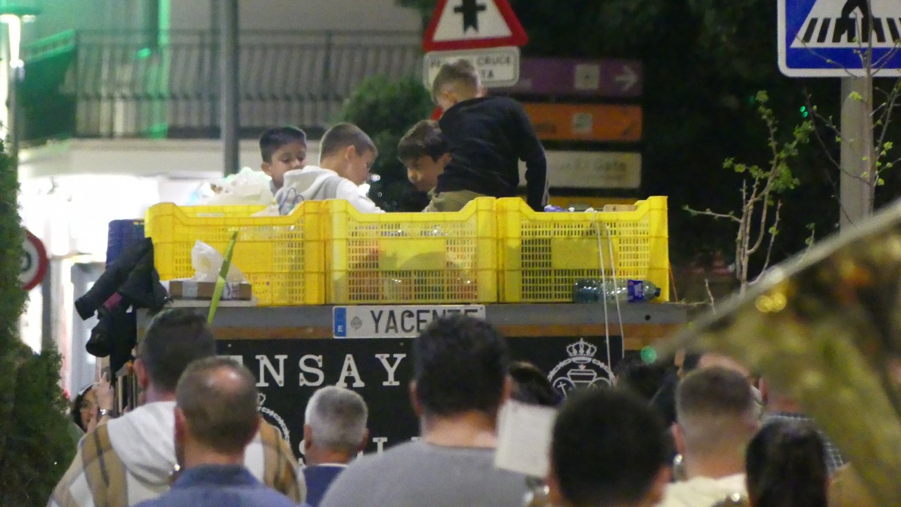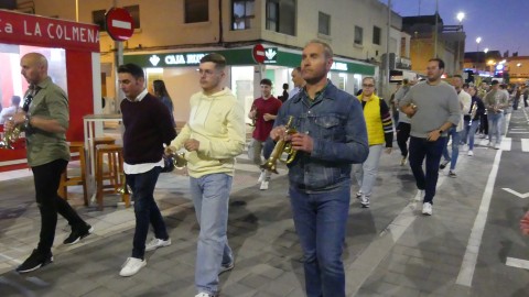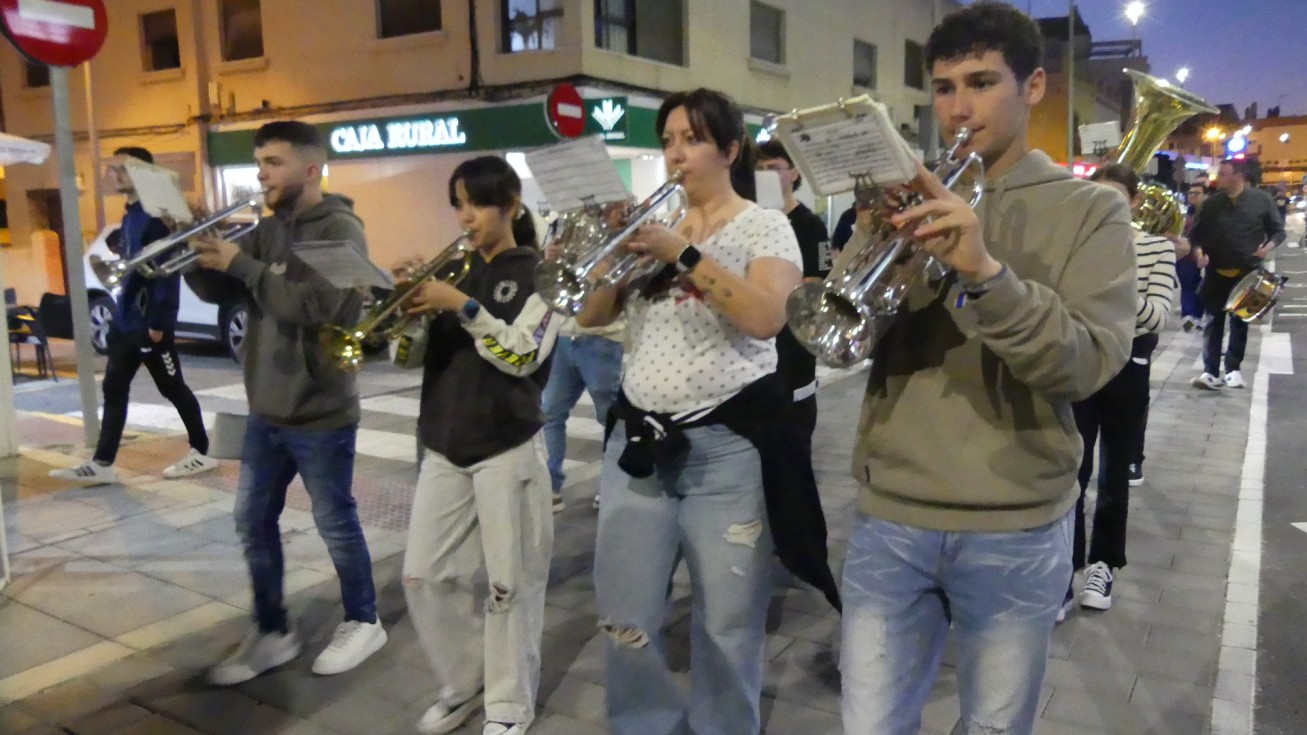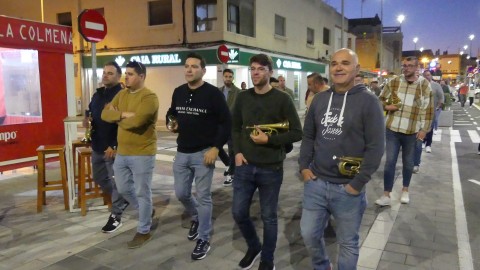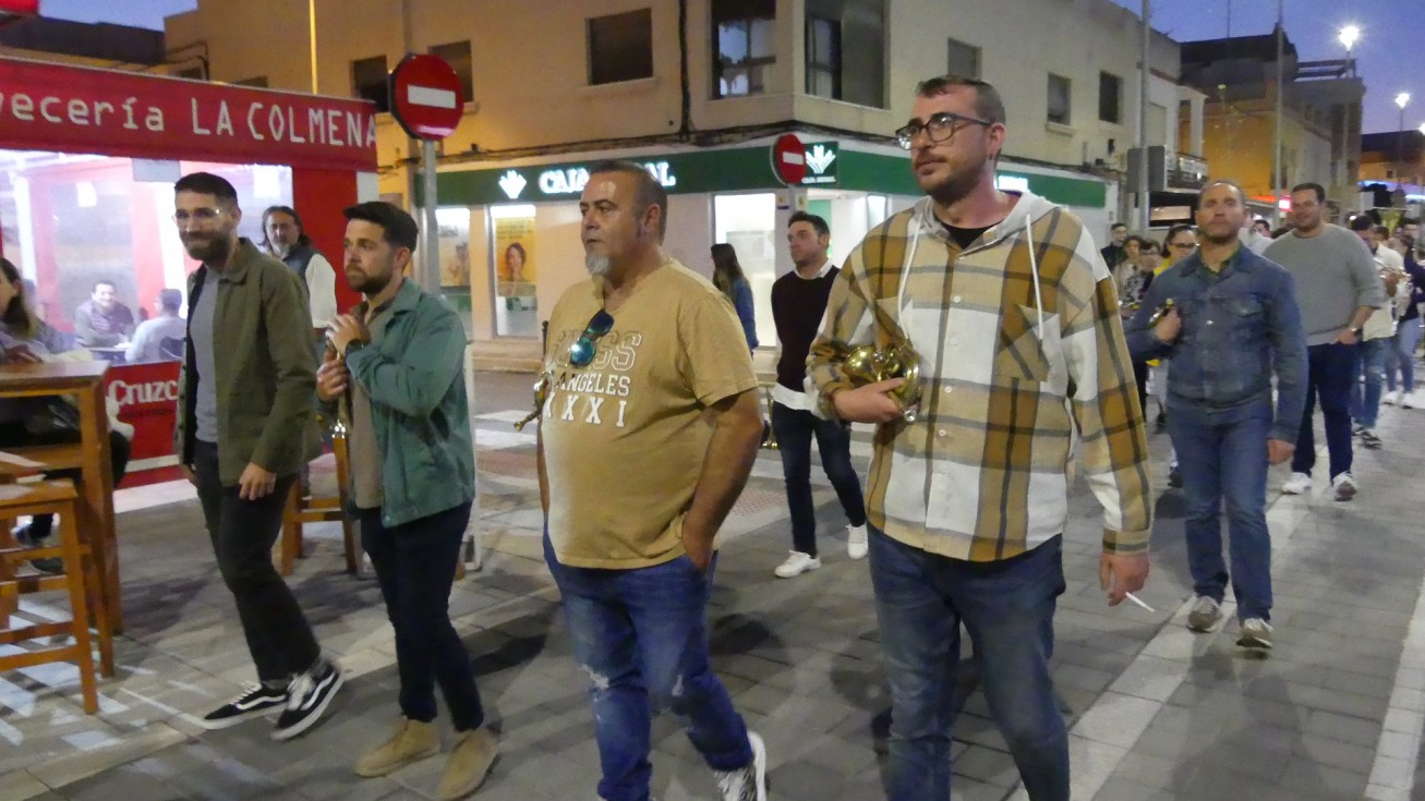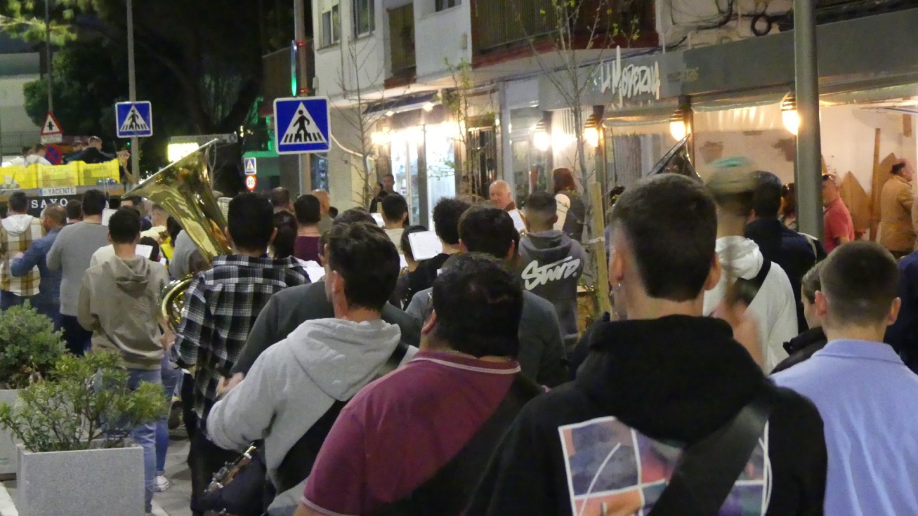 Desde las seis de la tarde, el grupo de hermanos de la Hermandad del Santo Entierro fue colaborando recogiendo las donaciones de comida que entregaban los vecinos mientras el paso iba pesando más gracias a esos gestos solidarios. Para acompañar, la banda de cornetas y tambores Zoilo Ruiz-Mateos tocó algunas marchas llamando así la atención a su paso.