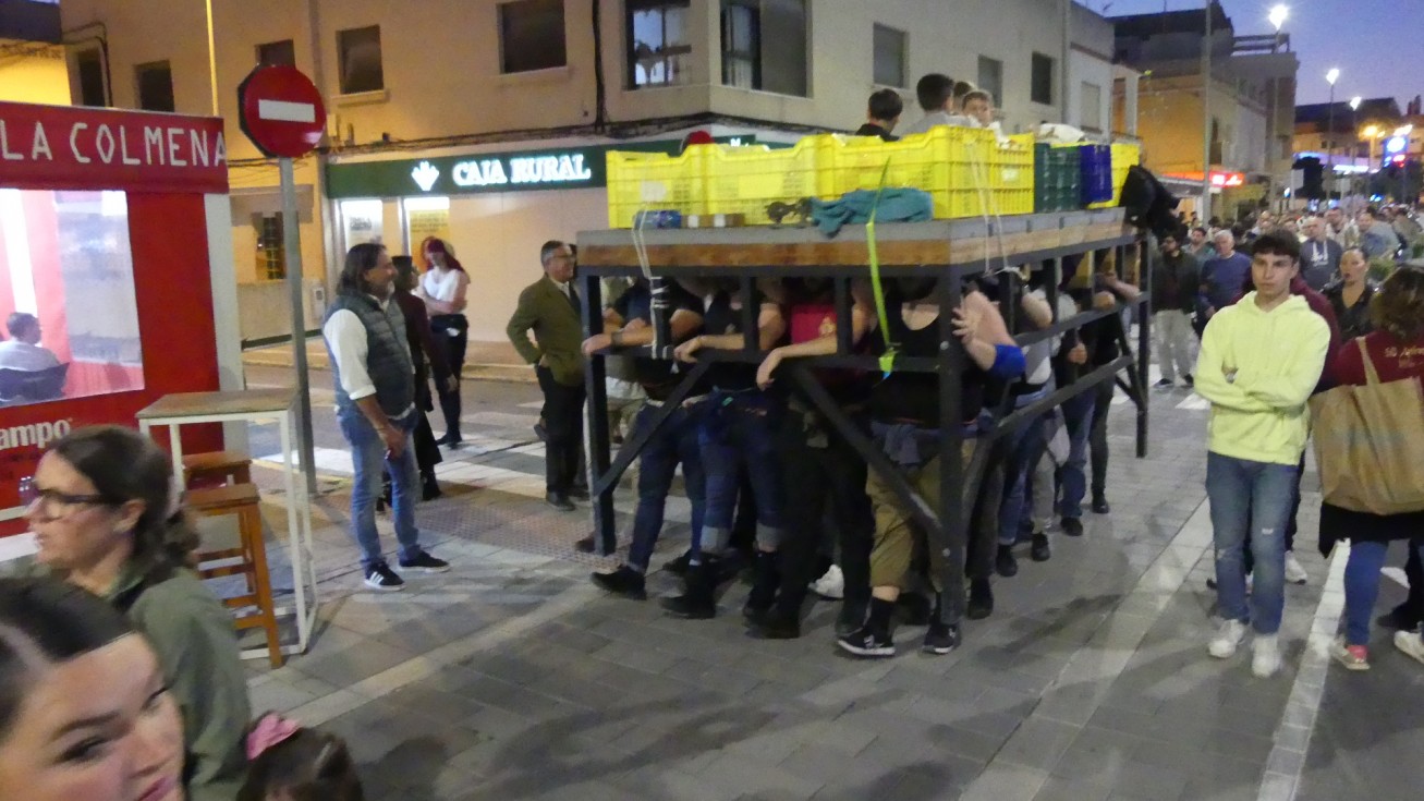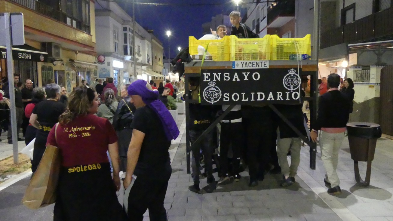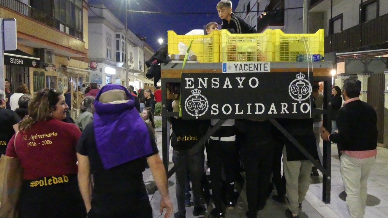 Como siempre, este ensayo, que sirve de preparación para la salida procesional del próximo Sábado Santo en Semana Santa, está enfocado a recoger alimentos, gracias a la solidaridad de aquellas personas que van cargando de kilos de comida la estructura del paso que llevan los costaleros.
