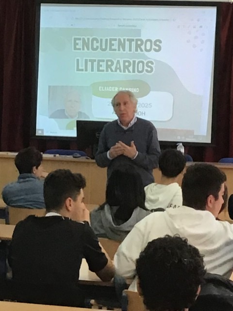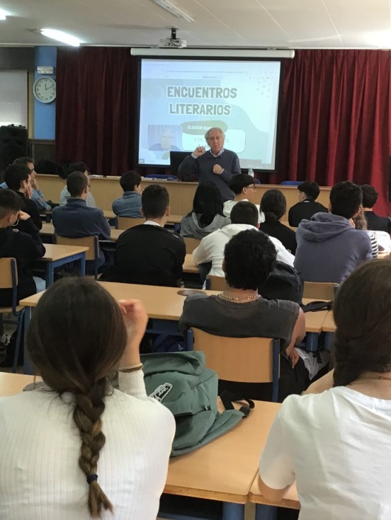 El pistoletazo de salida de estas jornadas literarias vino de la mano de Eliacer Cansino. El autor sevillano acercó a los alumnos de 1º de Bachillerato una de sus obras, 'El misterio Velázquez', y desde su particular carácter afable y empático, departió con los alumnos sobre cómo surgió la idea de la misma, además de expresar su admiración por el propio Velázquez y su obra 'Las Meninas'. Durante el transcurso de su exposición, se enfrentó a un alumnado muy activo que no paró de preguntar sobre diversos aspectos de su novela. Acompañado de su esposa, ambos quedaron satisfechos y encantados, tanto por el recibimiento como por la actitud de los chicos.