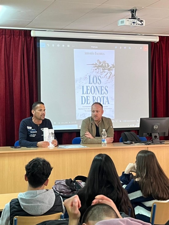 Antonio Fuentes, que el próximo día 25 de abril hará la presentación oficial de su obra en Rota, fue el encargado de cerrar las jornadas literarias. El autor mantuvo un encuentro con los alumnos de 2º de Bachillerato para hablar de su último libro, 'Los Leones de Rota', obra que recoge la historia de esta centuria falangista roteña que asoló la serranía de Cádiz, entre otros lugares. Antonio, a lo largo de su exposición, debido a sus ingentes investigaciones, mostró un conocimiento muy amplio sobre el periodo de la II República, la Guerra Civil y la posguerra, temas importantes para un alumnado que, en las próximas fechas, se enfrentará a la PEVAU.