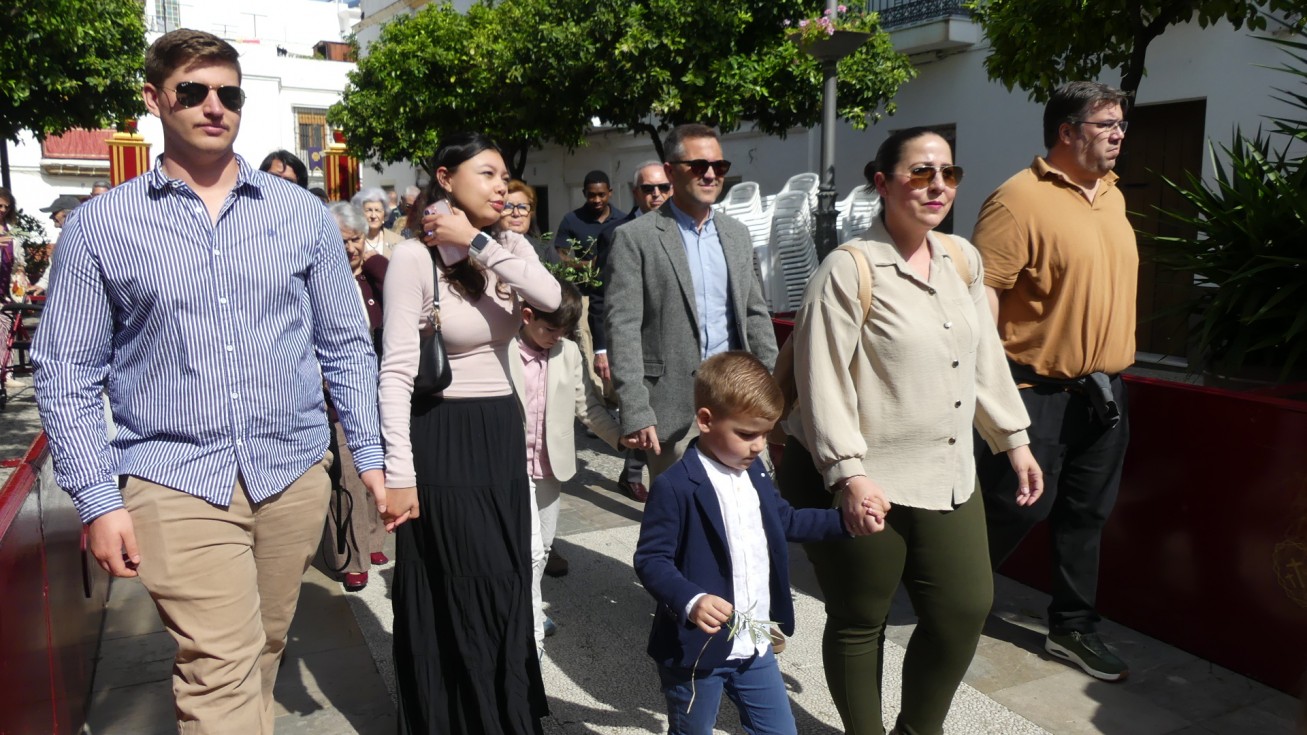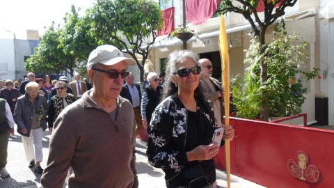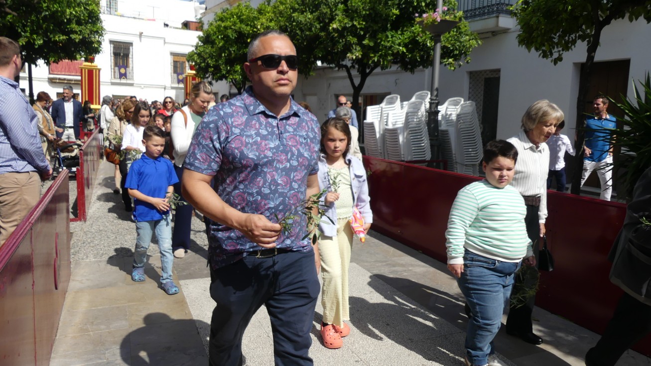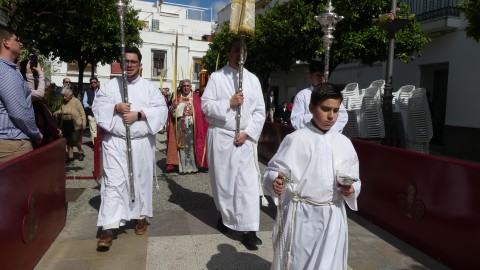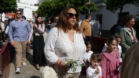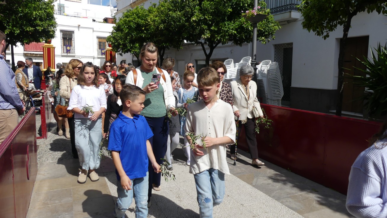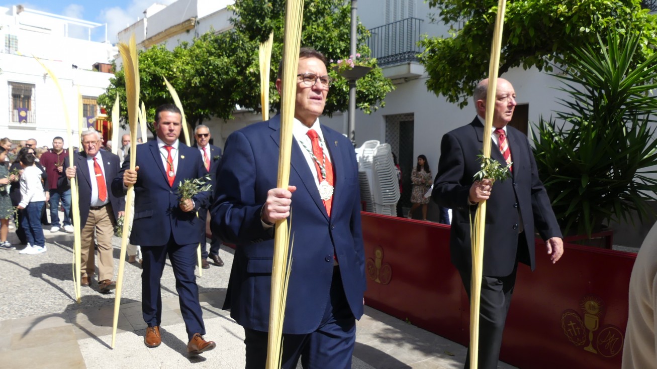 Una vez bendecidos los ramos que los ciudadanos han podido coger de unas bolsas, y las palmas que portaban los hermanos mayores, ha comenzado un pequeño recorrido hasta la parroquia de Nuestra Señora de la O, abriendo paso el cuerpo de acólitos con la cruz y los ciriales, seguido del sacerdote y el diácono, los hermanos con las palmas y detrás, los niños que se preparan para la Primera Comunión y los fieles con sus ramas de olivos bendecidas.