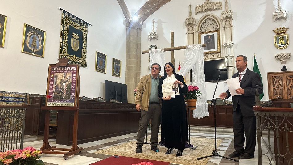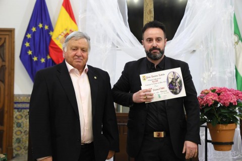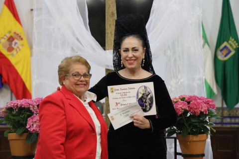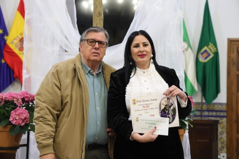 Miembros de la Peña Rociera Roteña y el alcalde de Rota, Javier Ruiz, en nombre del Ayuntamiento, fueron los encargados de entregar los premios que se completaron, además de con José Antonio Cuevas que se hizo con los 2.300 euros del primer premio, con el segundo premio dotado de 1.700 euros a Jesús León Márquez, de Mairena del Alcor (Sevilla); el tercer premio dotado de 1.300 euros Manuela Pérez Laino de Almonte (Huelva); el cuarto premio fue para Antonio Porcuna Mariscal, de Aldamuz (Córdoba) que recogió su premio de 450 euros, como también lo haría por la quinta posición Elisabeth Prior Bolívar de Utrera (Sevilla). La mejor letra dedicada a Rota, con 500 euros de premio, fue para el único saetero roteño que este año participaba en el concurso, Agustín Sánchez Bernal.