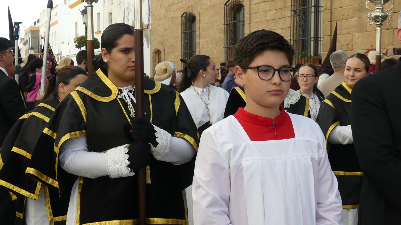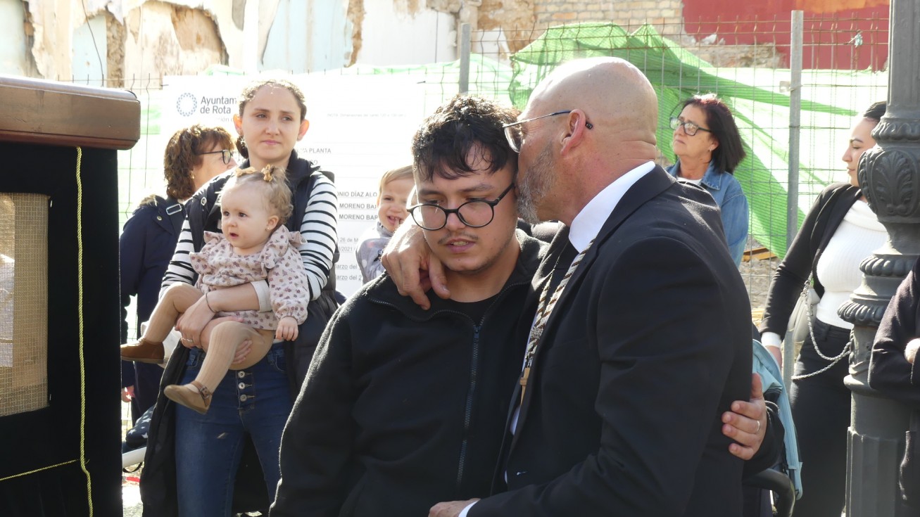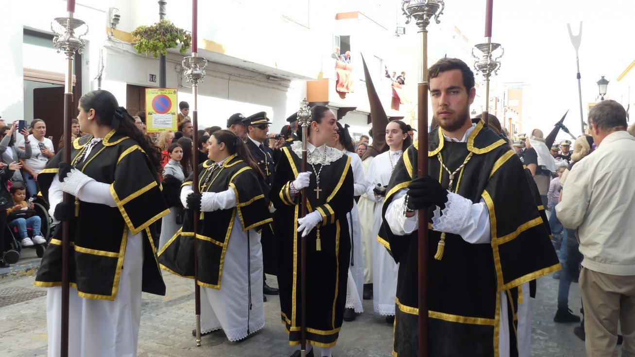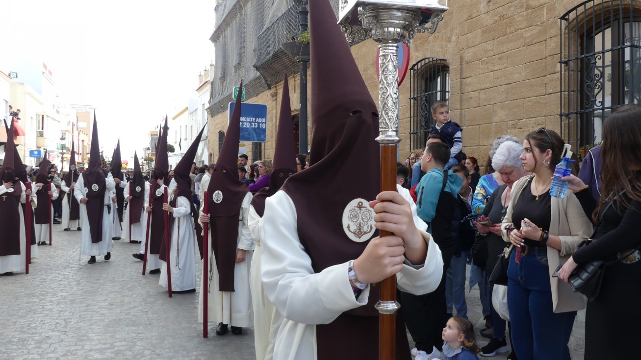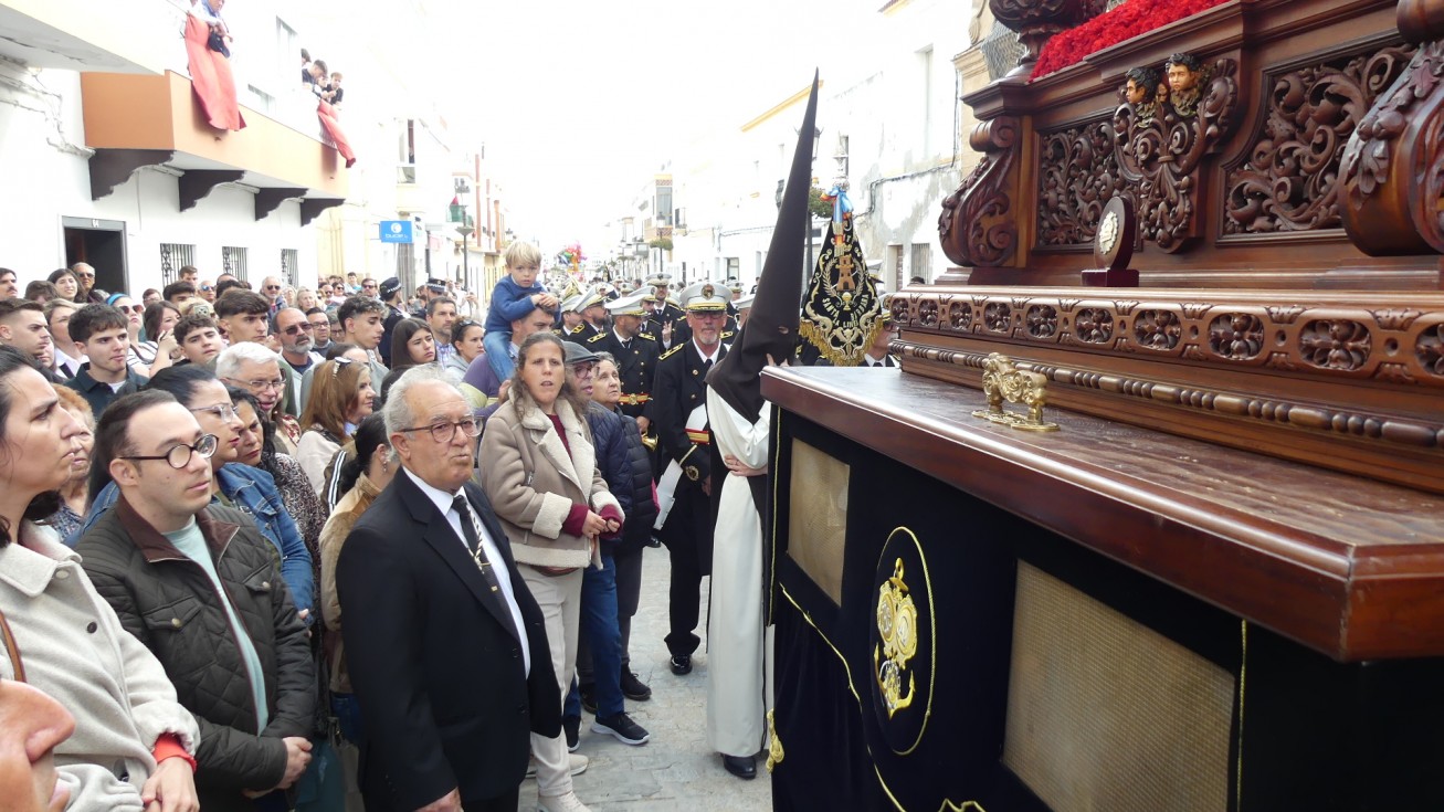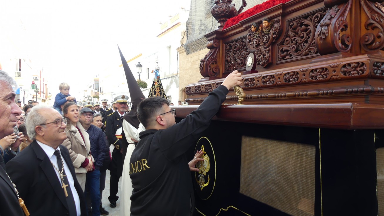 Antes de ese momento, la tarde comenzó con normalidad, y las puertas del Carmen abrían a las seis para dejar paso a un cortejo de unos 50 hermanos con túnica, entre los que destacaba un grupo de pequeños con esclavina, arropando al Amor y la Esperanza. La salida de ambos pasos suele ser larga porque dadas las dimensiones de la parroquia, es una vez en la calle Calvario cuando en el caso del Santísimo Cristo del Amor se tiene que alzar la imagen crucificada, terminar de colocar los guardabrisas y recomponer el paso para su discurrir por las calles de Rota. Es un trabajo de todos a una, guiados por el capataz José Antonio Moreno Puyana que se convierte en los ojos de una treintena de costaleros que cargan bajo el paso, este año, flanqueado de nuevo por una pareja de Protección Civil, hermano honorario de esta hermandad.