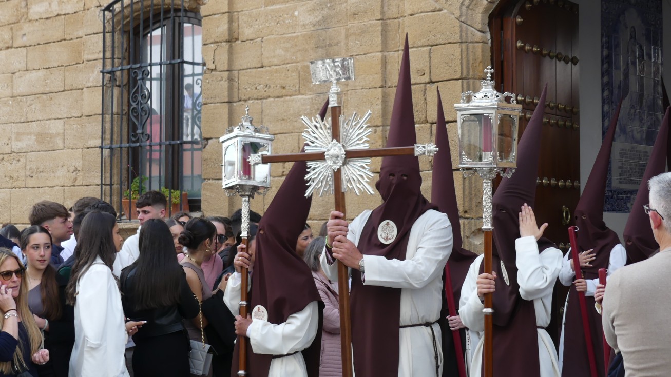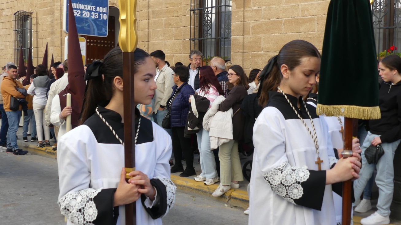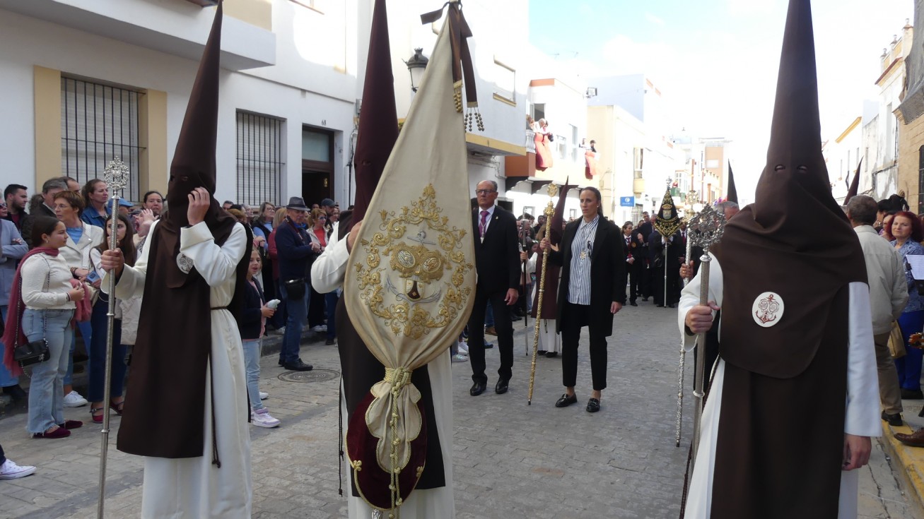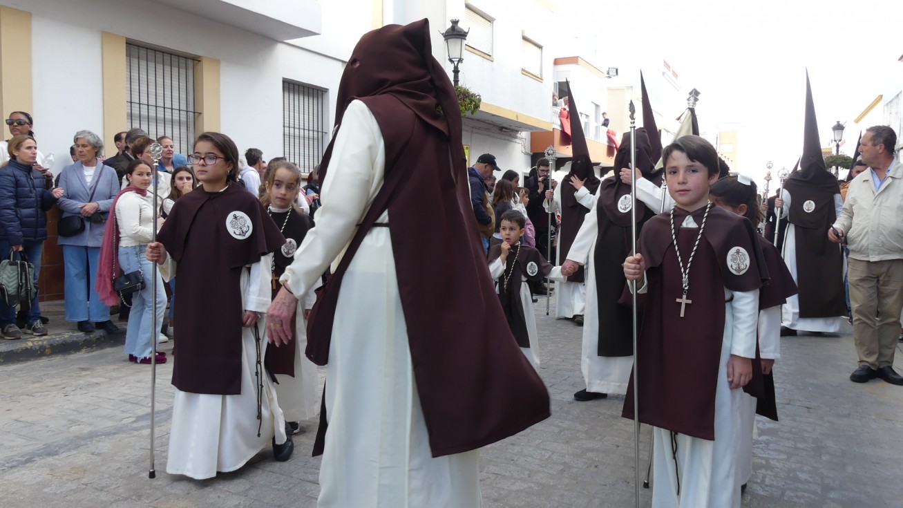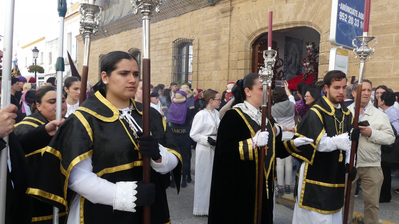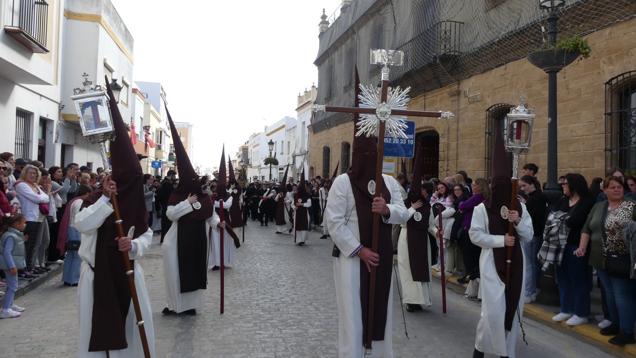 Antes de ese momento, la tarde comenzó con normalidad, y las puertas del Carmen abrían a las seis para dejar paso a un cortejo de unos 50 hermanos con túnica, entre los que destacaba un grupo de pequeños con esclavina, arropando al Amor y la Esperanza. La salida de ambos pasos suele ser larga porque dadas las dimensiones de la parroquia, es una vez en la calle Calvario cuando en el caso del Santísimo Cristo del Amor se tiene que alzar la imagen crucificada, terminar de colocar los guardabrisas y recomponer el paso para su discurrir por las calles de Rota. Es un trabajo de todos a una, guiados por el capataz José Antonio Moreno Puyana que se convierte en los ojos de una treintena de costaleros que cargan bajo el paso, este año, flanqueado de nuevo por una pareja de Protección Civil, hermano honorario de esta hermandad.