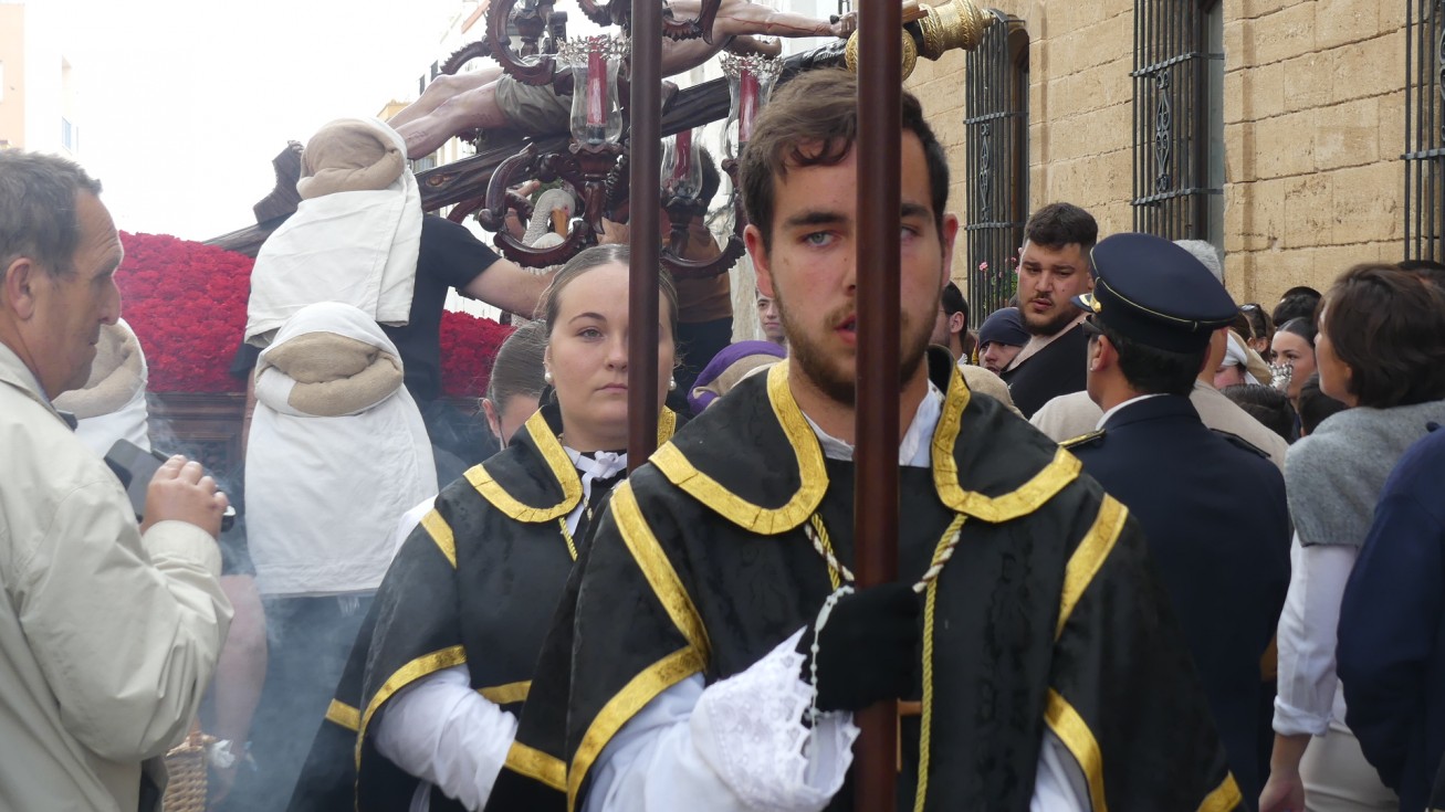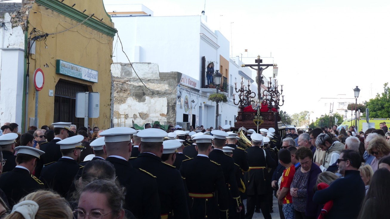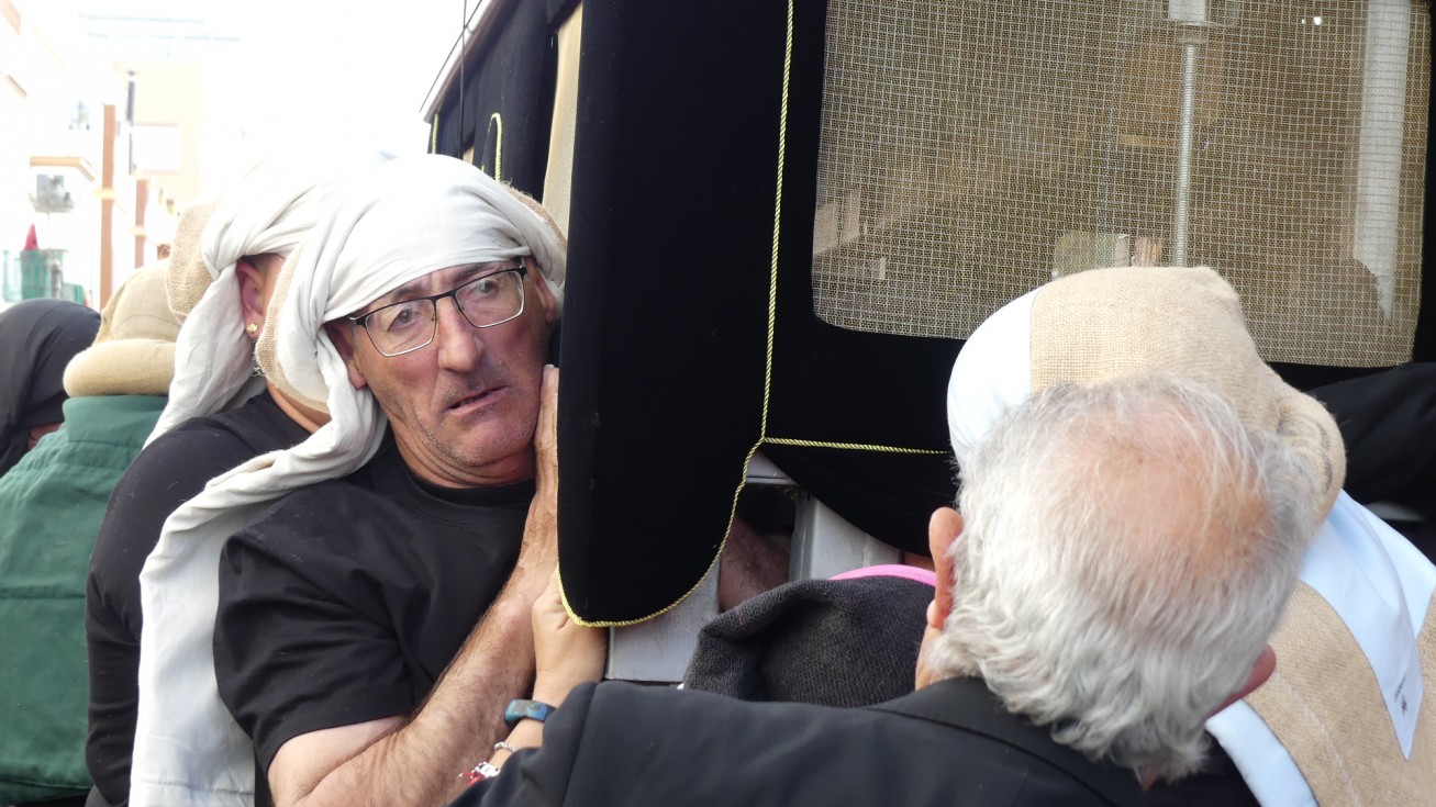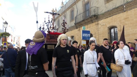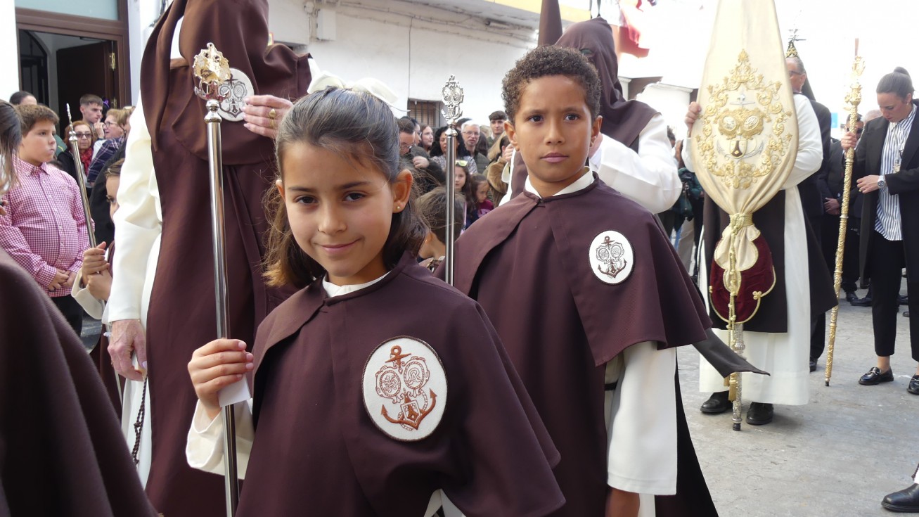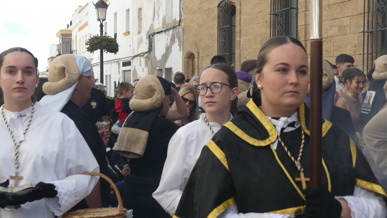 Antes de ese momento, la tarde comenzó con normalidad, y las puertas del Carmen abrían a las seis para dejar paso a un cortejo de unos 50 hermanos con túnica, entre los que destacaba un grupo de pequeños con esclavina, arropando al Amor y la Esperanza. La salida de ambos pasos suele ser larga porque dadas las dimensiones de la parroquia, es una vez en la calle Calvario cuando en el caso del Santísimo Cristo del Amor se tiene que alzar la imagen crucificada, terminar de colocar los guardabrisas y recomponer el paso para su discurrir por las calles de Rota. Es un trabajo de todos a una, guiados por el capataz José Antonio Moreno Puyana que se convierte en los ojos de una treintena de costaleros que cargan bajo el paso, este año, flanqueado de nuevo por una pareja de Protección Civil, hermano honorario de esta hermandad.