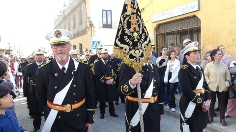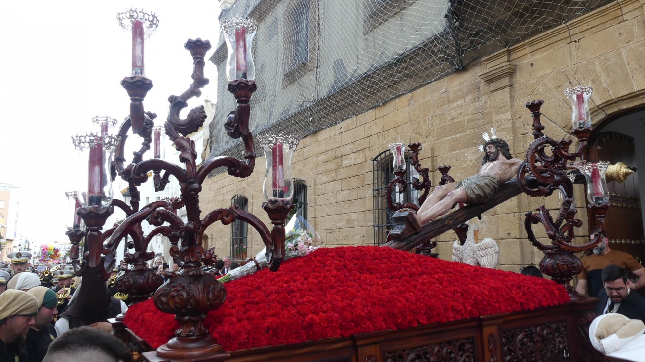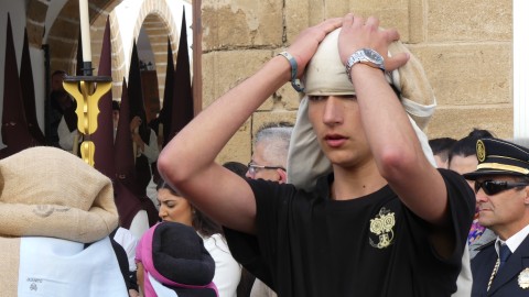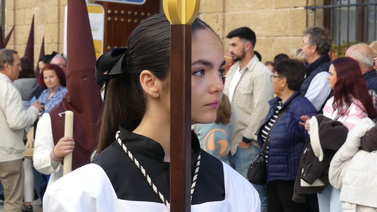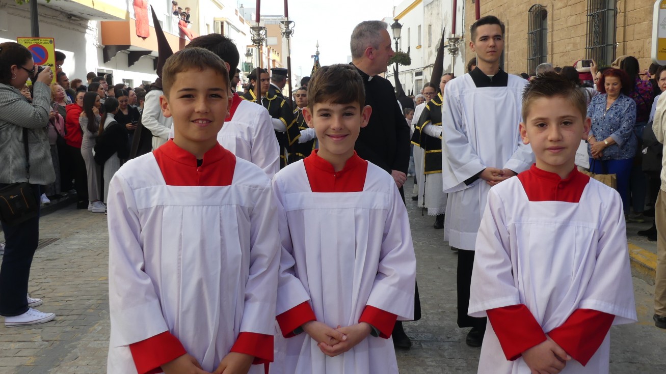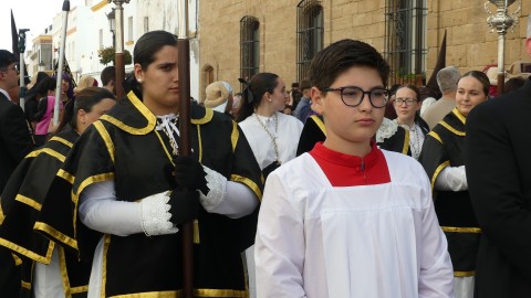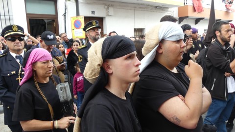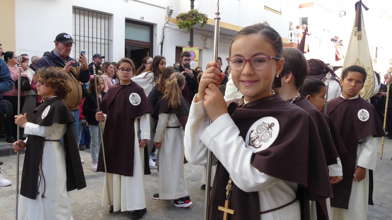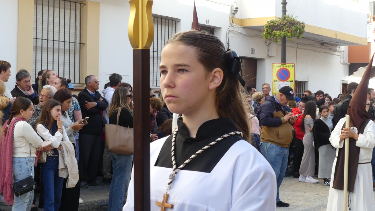 Antes de ese momento, la tarde comenzó con normalidad, y las puertas del Carmen abrían a las seis para dejar paso a un cortejo de unos 50 hermanos con túnica, entre los que destacaba un grupo de pequeños con esclavina, arropando al Amor y la Esperanza. La salida de ambos pasos suele ser larga porque dadas las dimensiones de la parroquia, es una vez en la calle Calvario cuando en el caso del Santísimo Cristo del Amor se tiene que alzar la imagen crucificada, terminar de colocar los guardabrisas y recomponer el paso para su discurrir por las calles de Rota. Es un trabajo de todos a una, guiados por el capataz José Antonio Moreno Puyana que se convierte en los ojos de una treintena de costaleros que cargan bajo el paso, este año, flanqueado de nuevo por una pareja de Protección Civil, hermano honorario de esta hermandad.