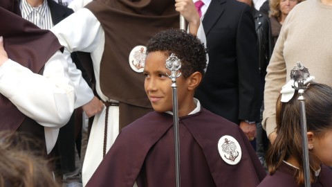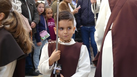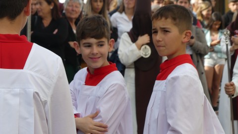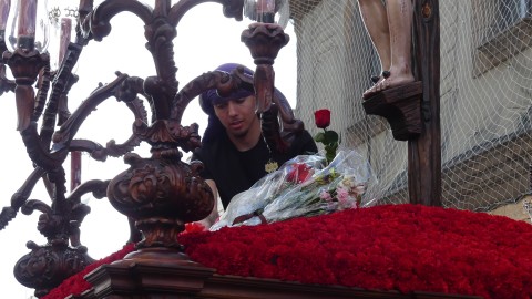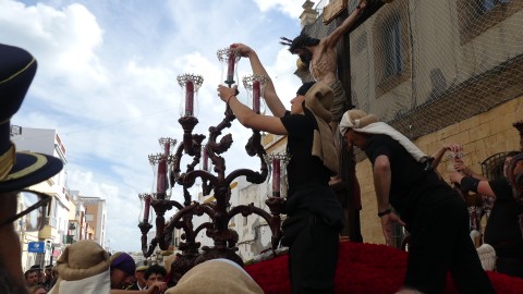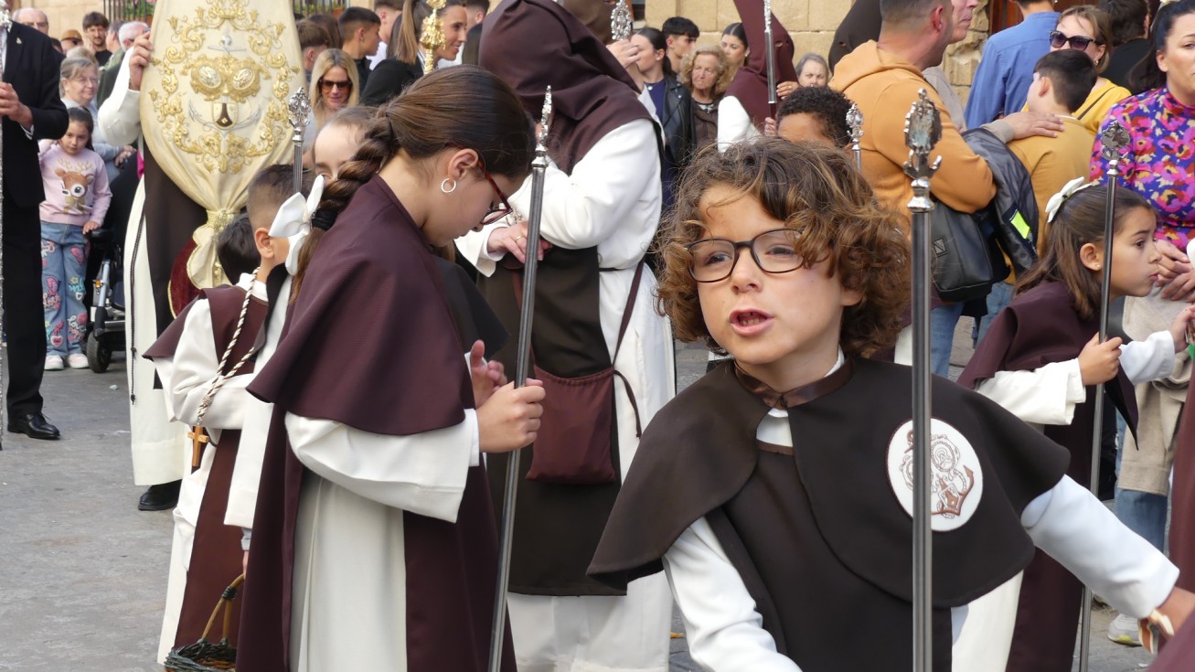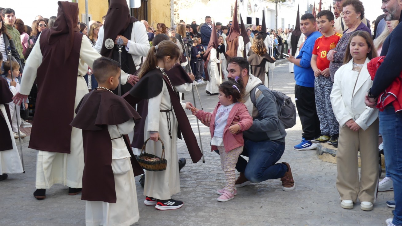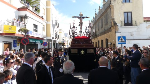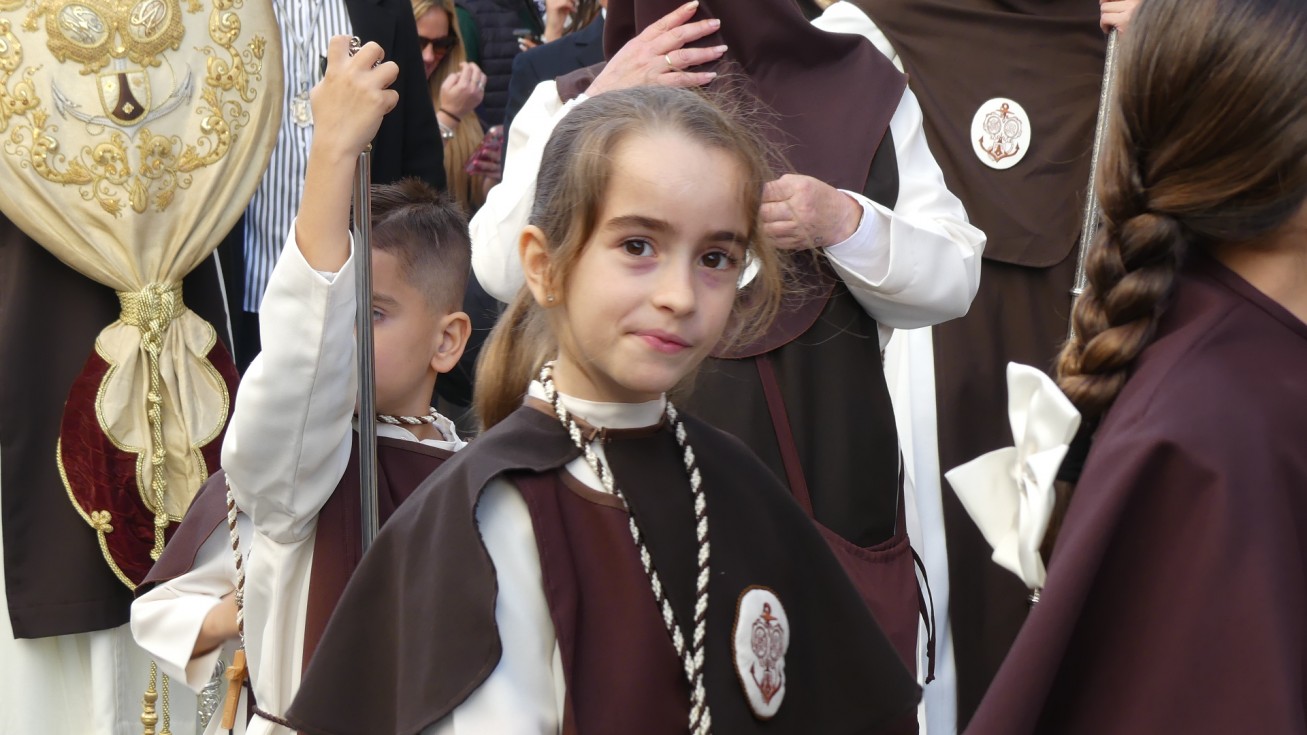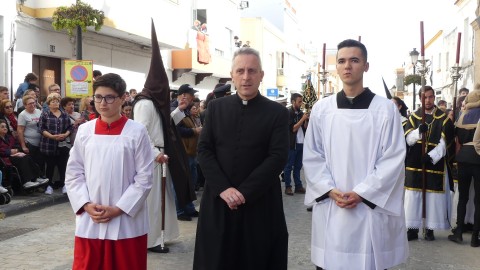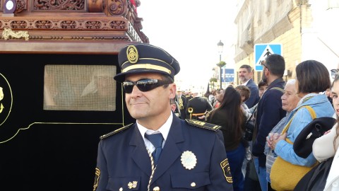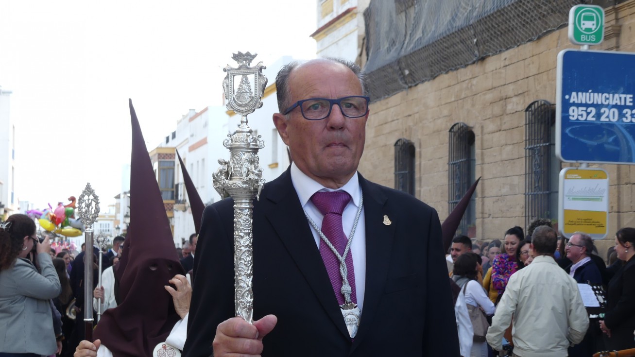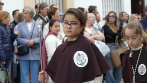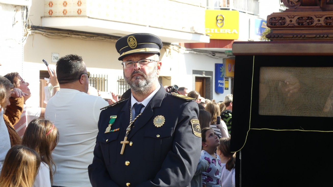 Antes de ese momento, la tarde comenzó con normalidad, y las puertas del Carmen abrían a las seis para dejar paso a un cortejo de unos 50 hermanos con túnica, entre los que destacaba un grupo de pequeños con esclavina, arropando al Amor y la Esperanza. La salida de ambos pasos suele ser larga porque dadas las dimensiones de la parroquia, es una vez en la calle Calvario cuando en el caso del Santísimo Cristo del Amor se tiene que alzar la imagen crucificada, terminar de colocar los guardabrisas y recomponer el paso para su discurrir por las calles de Rota. Es un trabajo de todos a una, guiados por el capataz José Antonio Moreno Puyana que se convierte en los ojos de una treintena de costaleros que cargan bajo el paso, este año, flanqueado de nuevo por una pareja de Protección Civil, hermano honorario de esta hermandad.