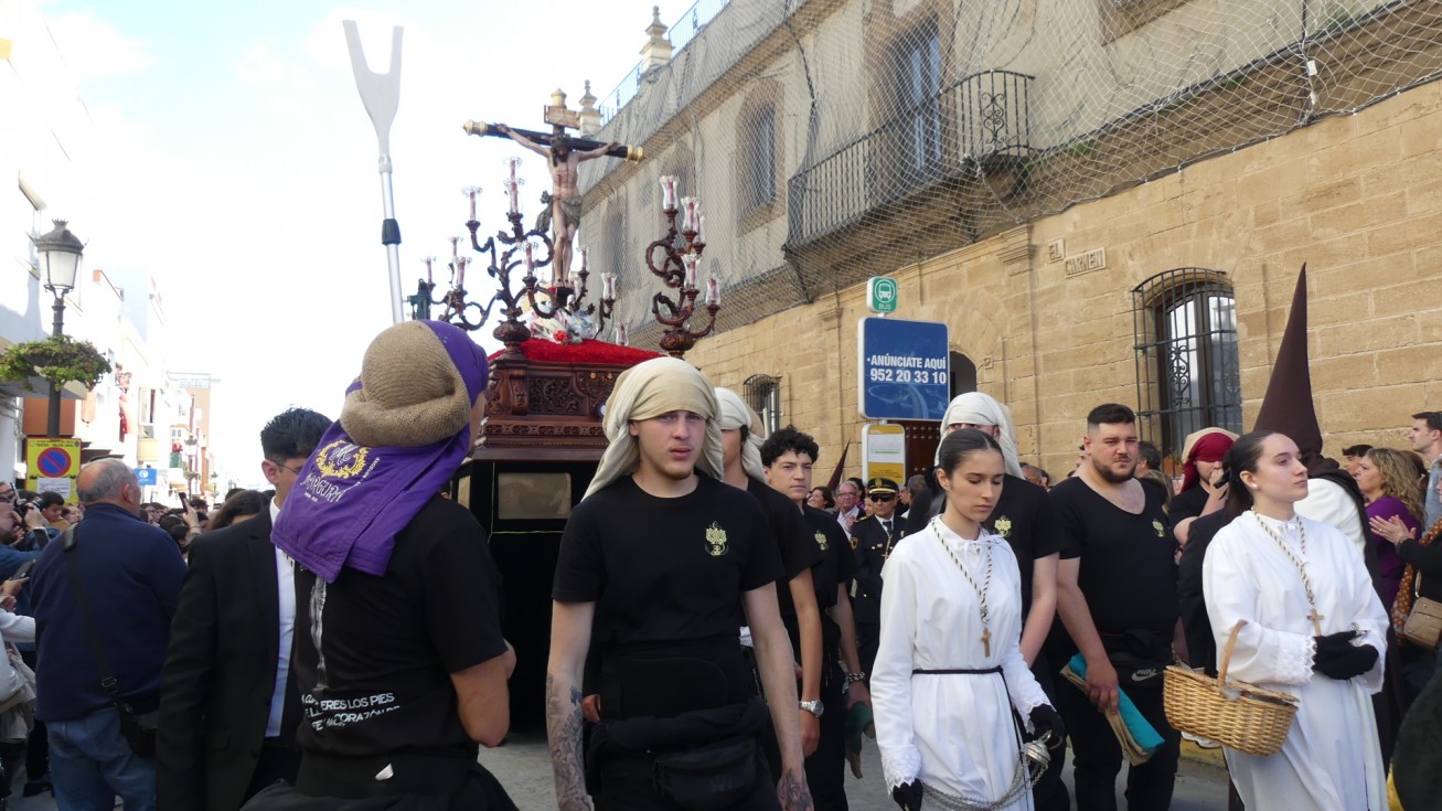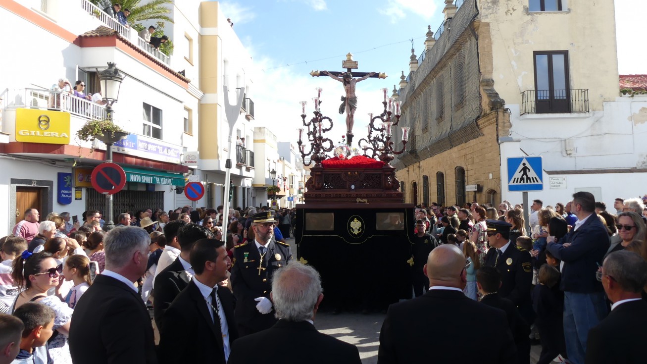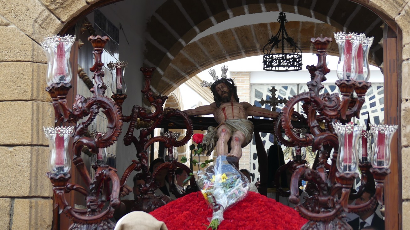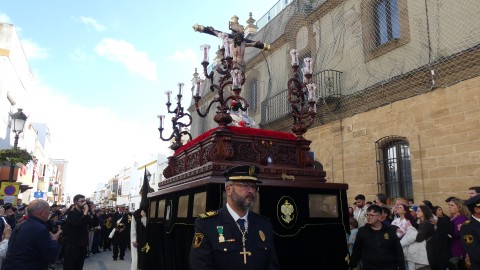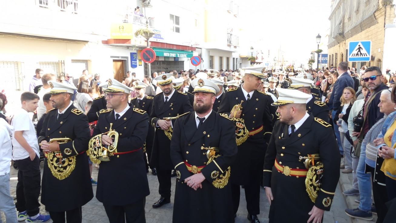 La salida procesional de este Jesús crucificado empezaba con las primeras marchas de la Banda de Cornetas y Tambores Santa Bárbara de La Línea de la Concepción (Cádiz), que ya estuvo poniendo los acordes musicales el año pasado.