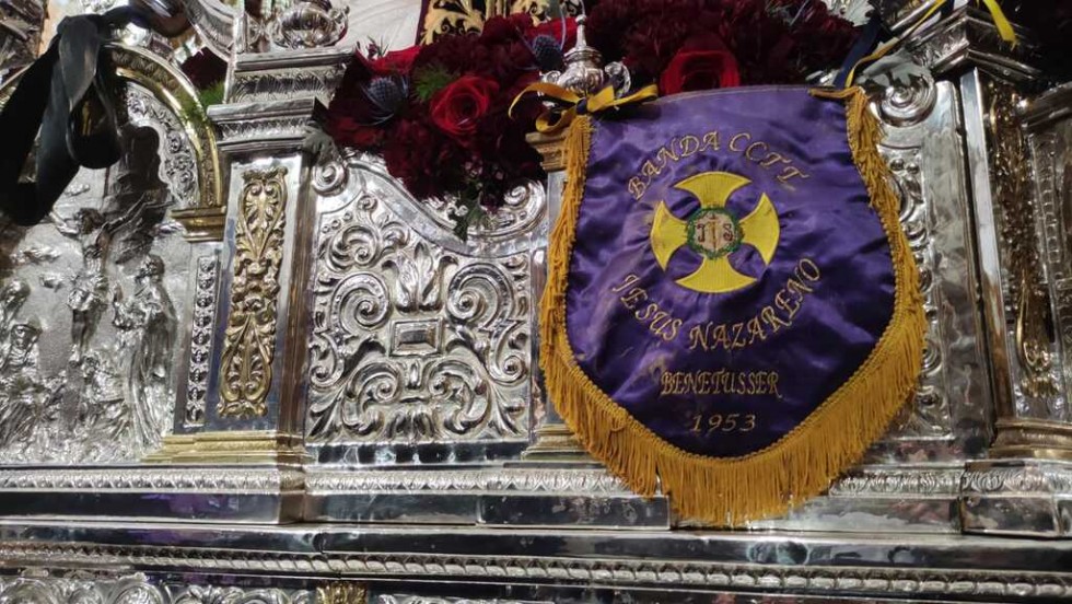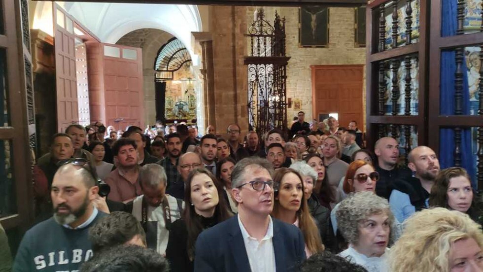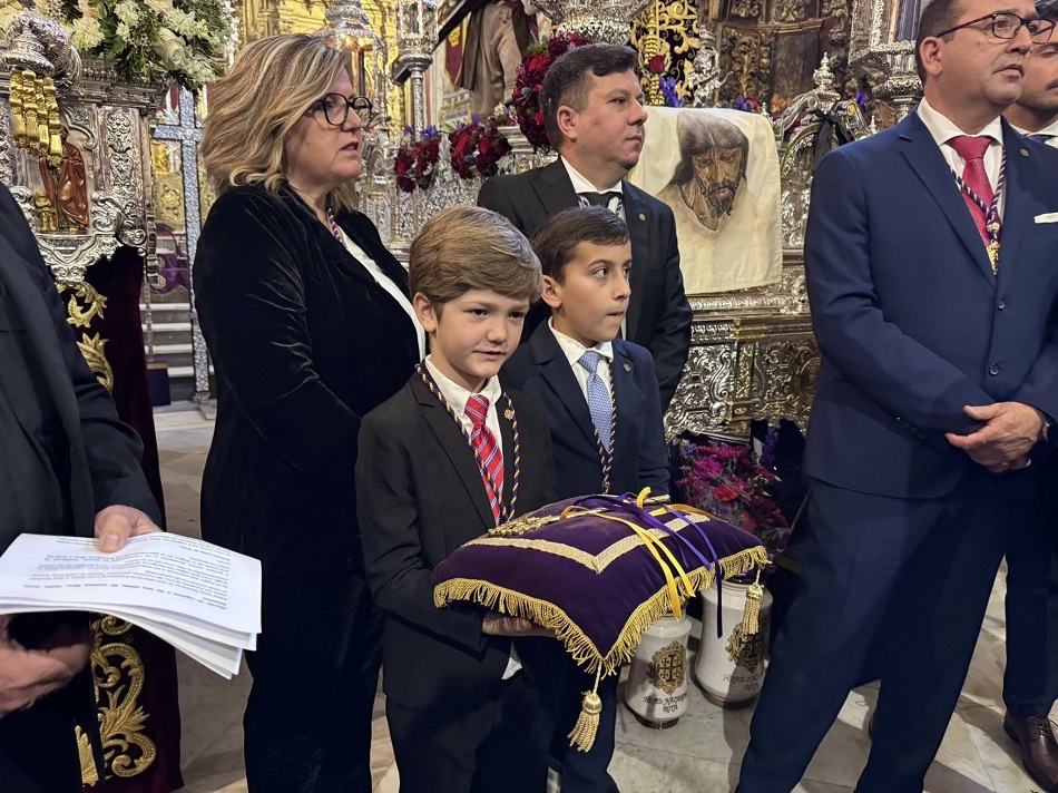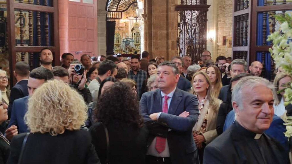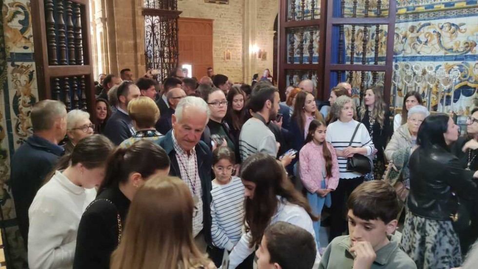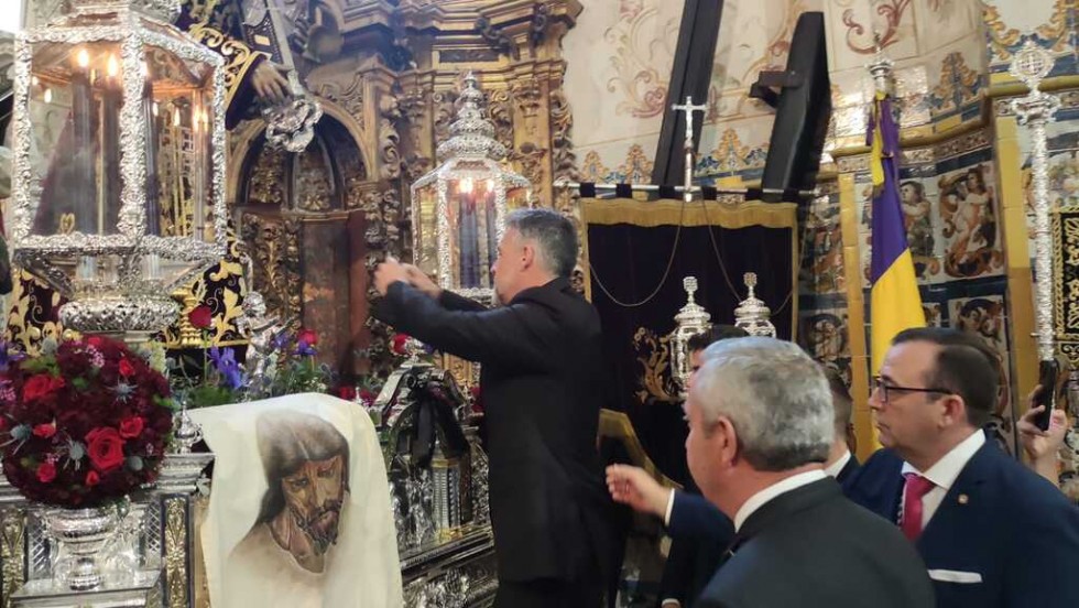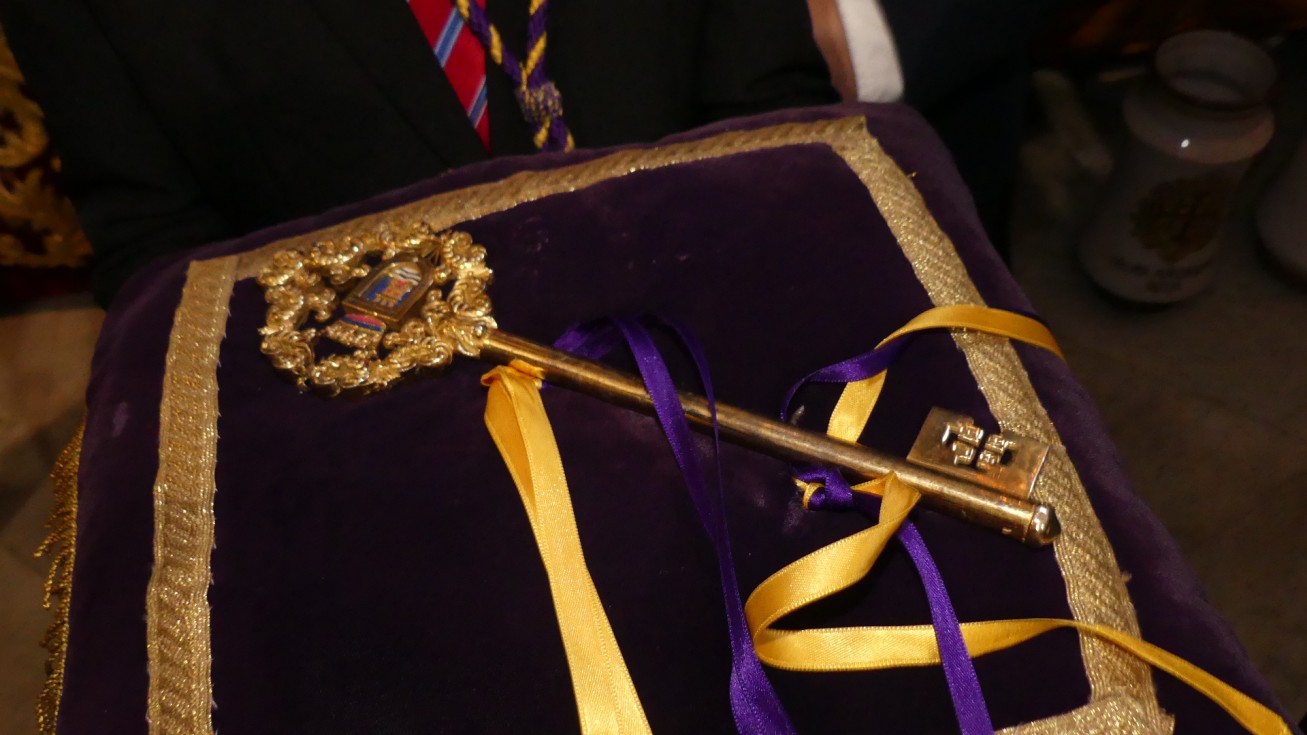 Con una capilla llena, con miembros de la Corporación municipal y de la juntad e gobierno de la Hermandad del Nazareno, el alcalde de Rota, Javier Ruiz, ha colocado las llaves de la ciudad enn las manos del ángel que está situado a las plantas de Jesús en el paso, y que estará visible durante toda la estación de penitencia.