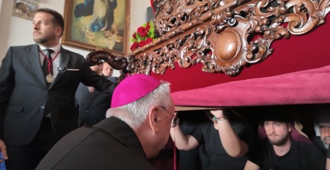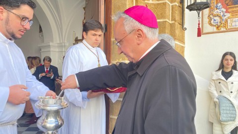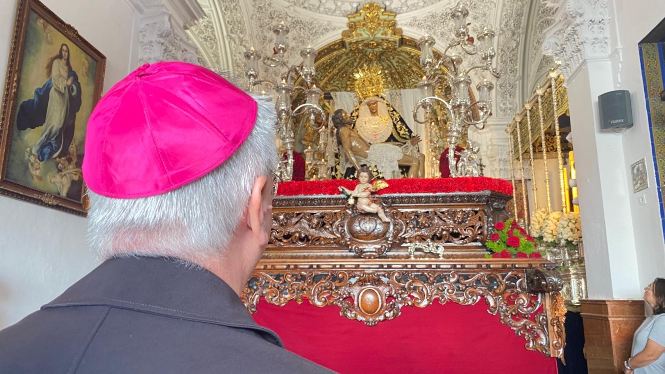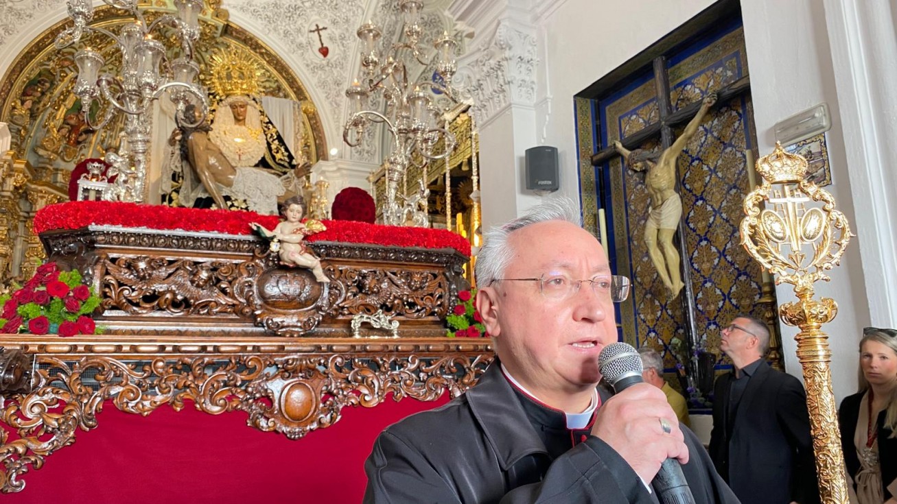 El máximo representante de la iglesia en la Diócesis de Asidonia Jerez ha trasladado a los hermanos costaleros un mensaje de ánimo y de agradecimiento por el esfuerzo que realizarán en la tarde de este Jueves Santo llevando el peso de la virgen sobre sus hombros. "Gracias por el esfuerzo de estos días, debéis vivirlo con la conciencia de saberos elegidos del Señor para llevar a su madre", les ha trasladado el obispo a la cuadrilla ya bajo las trabajaderas.