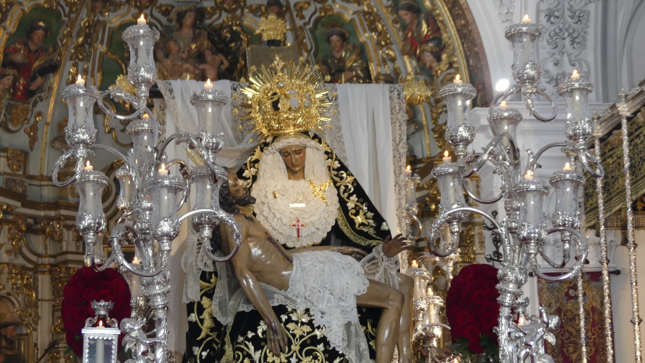 Hoy es el día grande la Hermandad de los Dolores de Rota y así se ha vivido esta mañana en la capilla de la Caridad, donde como siempre, se ha rezado el Ángelus y se ha llevado a cabo el retranqueo del paso que porta a Nuestra Señora de los Dolores con el Santísimo Cristo de la Caridad yacente en su regazo que a las siete de la tarde, comenzará a recorrer las calles de la villa.