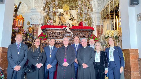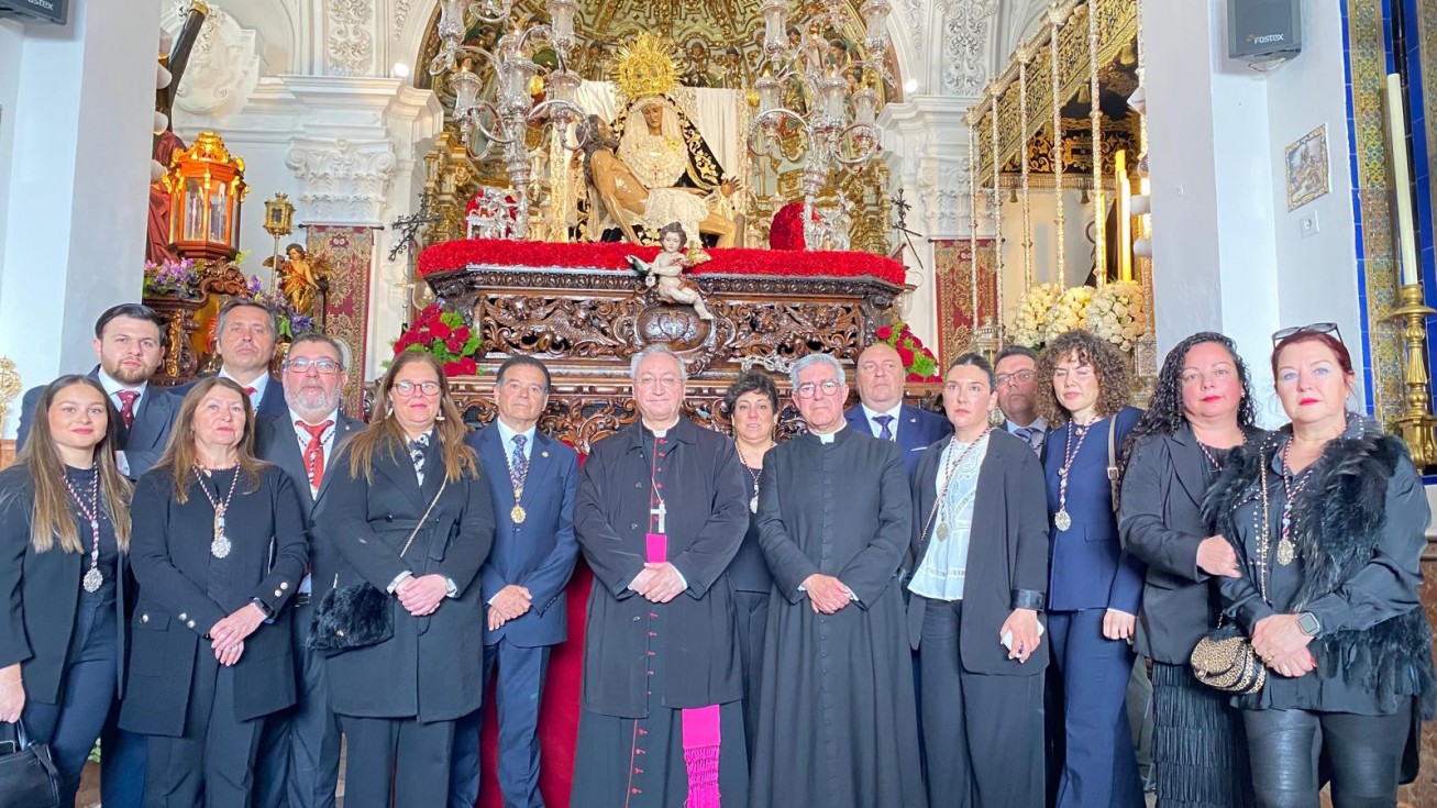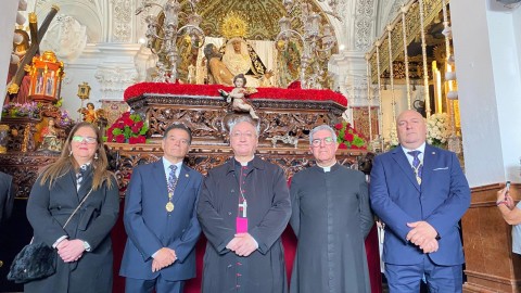 En este quinto día de la Semana Santa de Rota, 17 de abril, se cumplen 89 años desde que la antigua imagen de los Dolores fuera quemada a las puertas de la ermita de San Juan Bautista, hoy vulgo de la Caridad, y con tal fecha señalada coincidiendo en Jueves Santo, se ha contado con la visita del obispo de la Diócesis de Asidonia Jerez, José Rico Pavés. Una visita que ha engrandecido estas horas previas a la estación de penitencia y que ha permitido a fieles y devotos compartir el rezo de unas oraciones ante el paso imponente de la virgen.