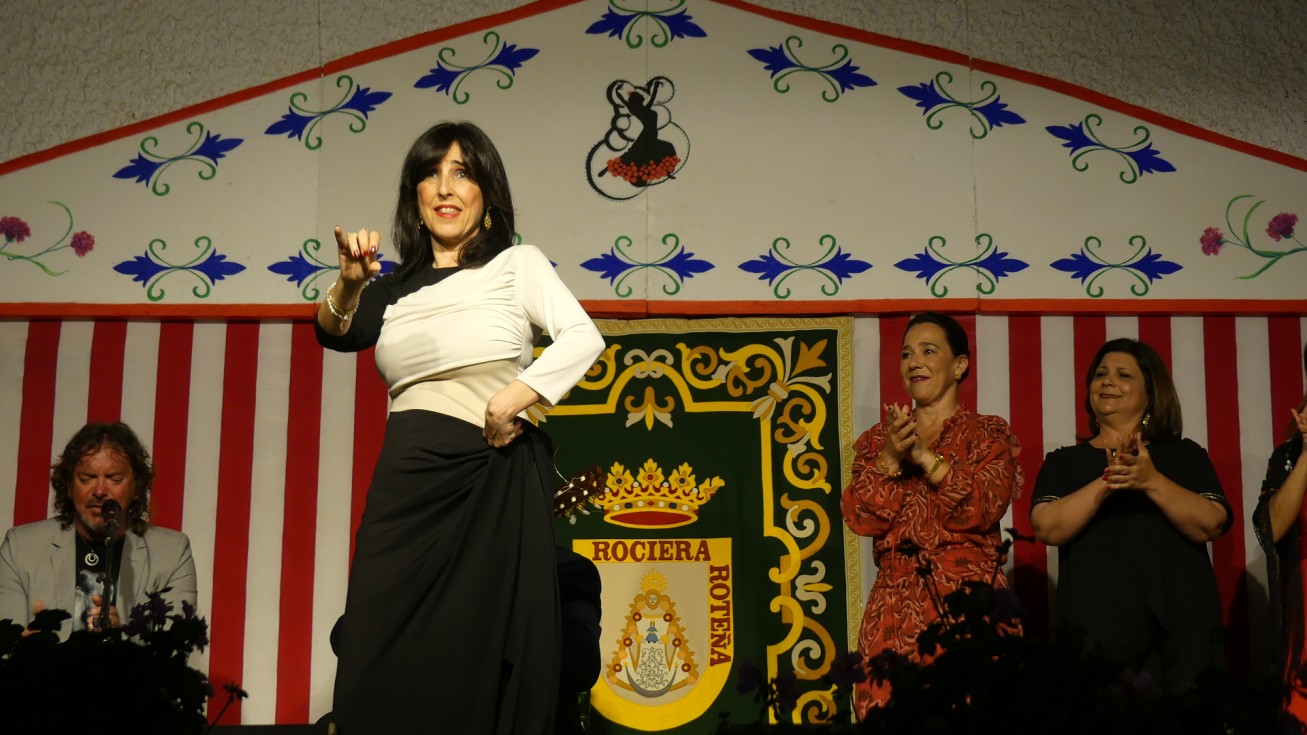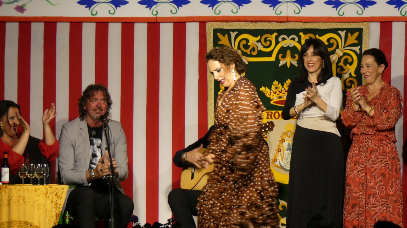 La caseta 'Nueva Jarilla', que ya se prepara para estos días grandes al igual que todo el recinto ferial, se ha llenado de socios de la Peña Rociera Roteña, que organiza el evento, así como de amigos, familiares y alumnos de Laura Pirri que no han querido perderse el momento que la pregonera ha disfrutado con mucha ilusión compartiendo sus sentimientos hacia una feria que vive intensamente, como bailaora y como roteña.