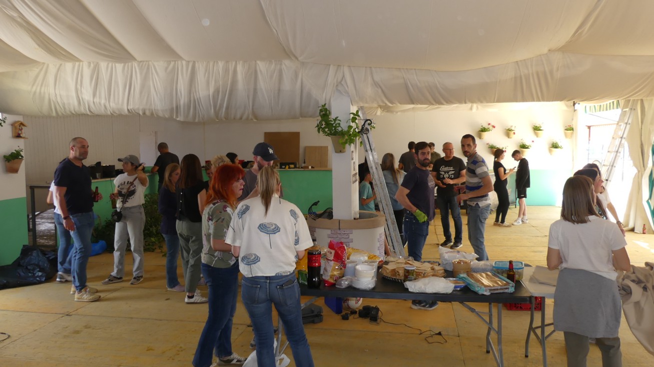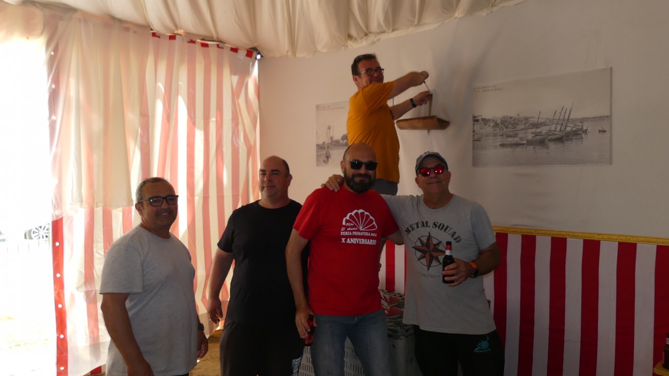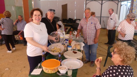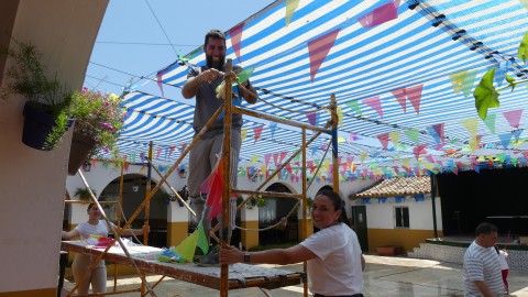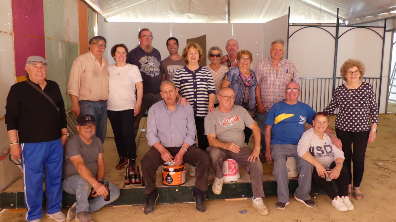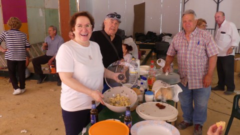 Como siempre, y es un clásico, hay socios que se implican más que otros en los trabajos, pero no falla que a la hora de la comida, aparezcan casi todos, porque la preferia, a parte de montaje, también es compartir algo de picas y beber entre andamios, trompos, martillos, macetas, mangueras, farolillos y telas.