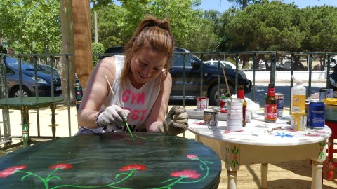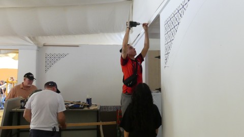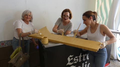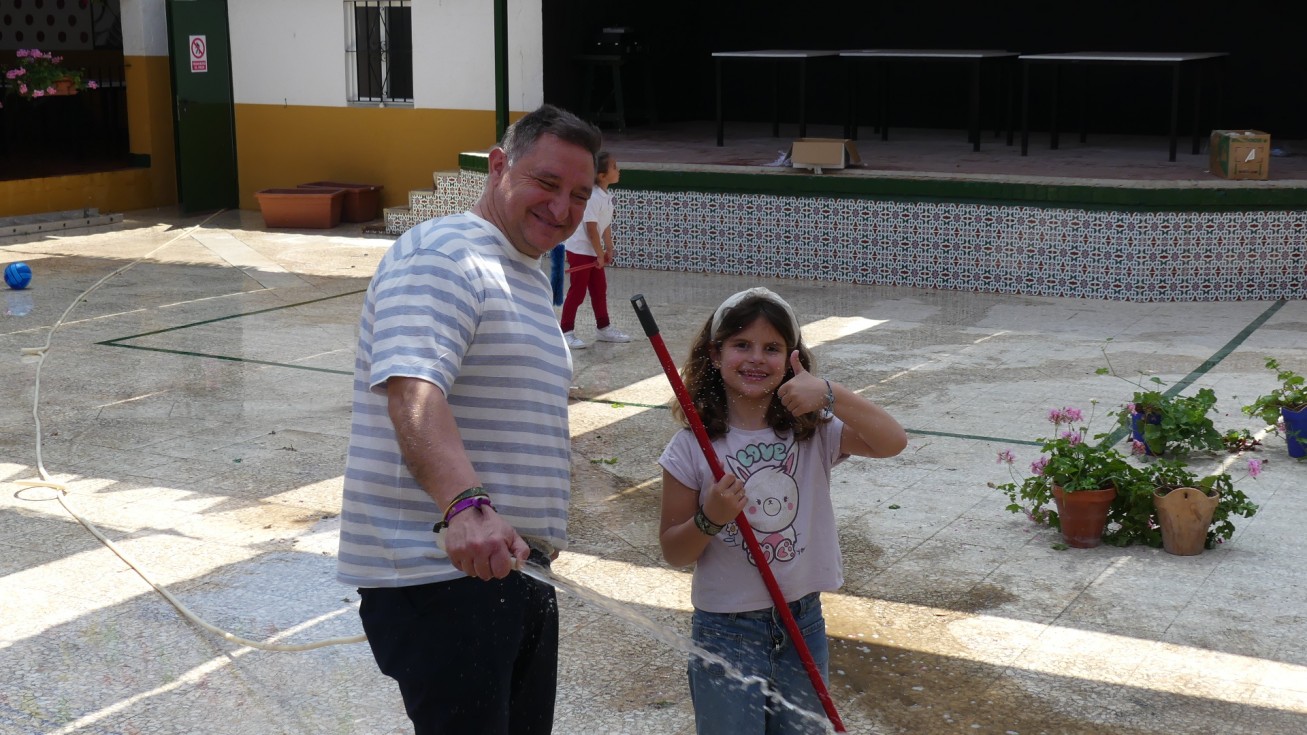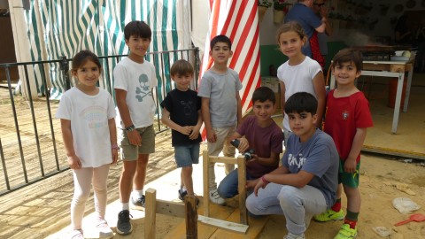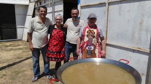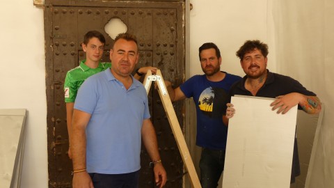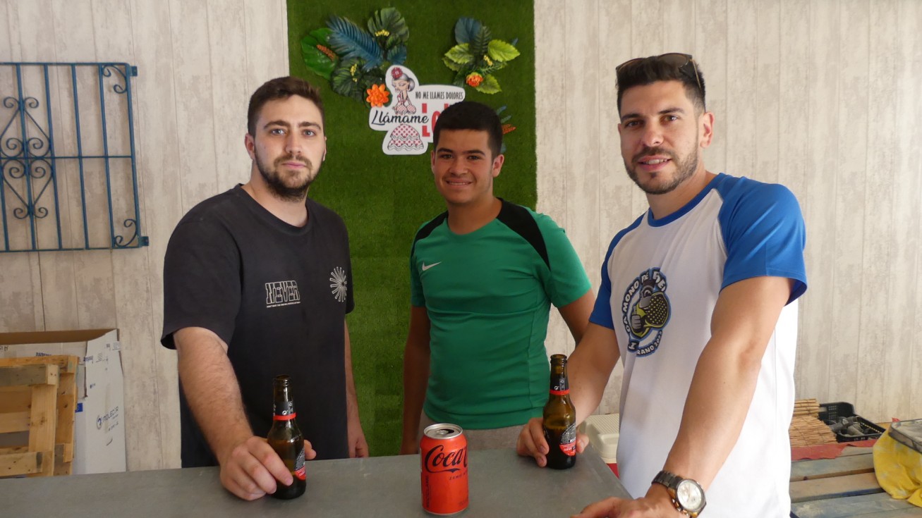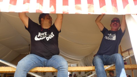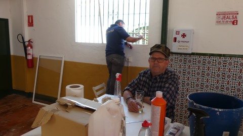 Como siempre, y es un clásico, hay socios que se implican más que otros en los trabajos, pero no falla que a la hora de la comida, aparezcan casi todos, porque la preferia, a parte de montaje, también es compartir algo de picas y beber entre andamios, trompos, martillos, macetas, mangueras, farolillos y telas.